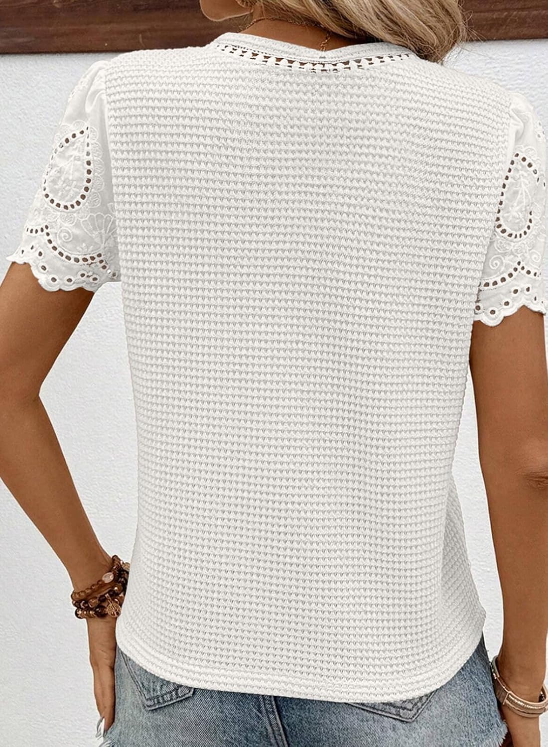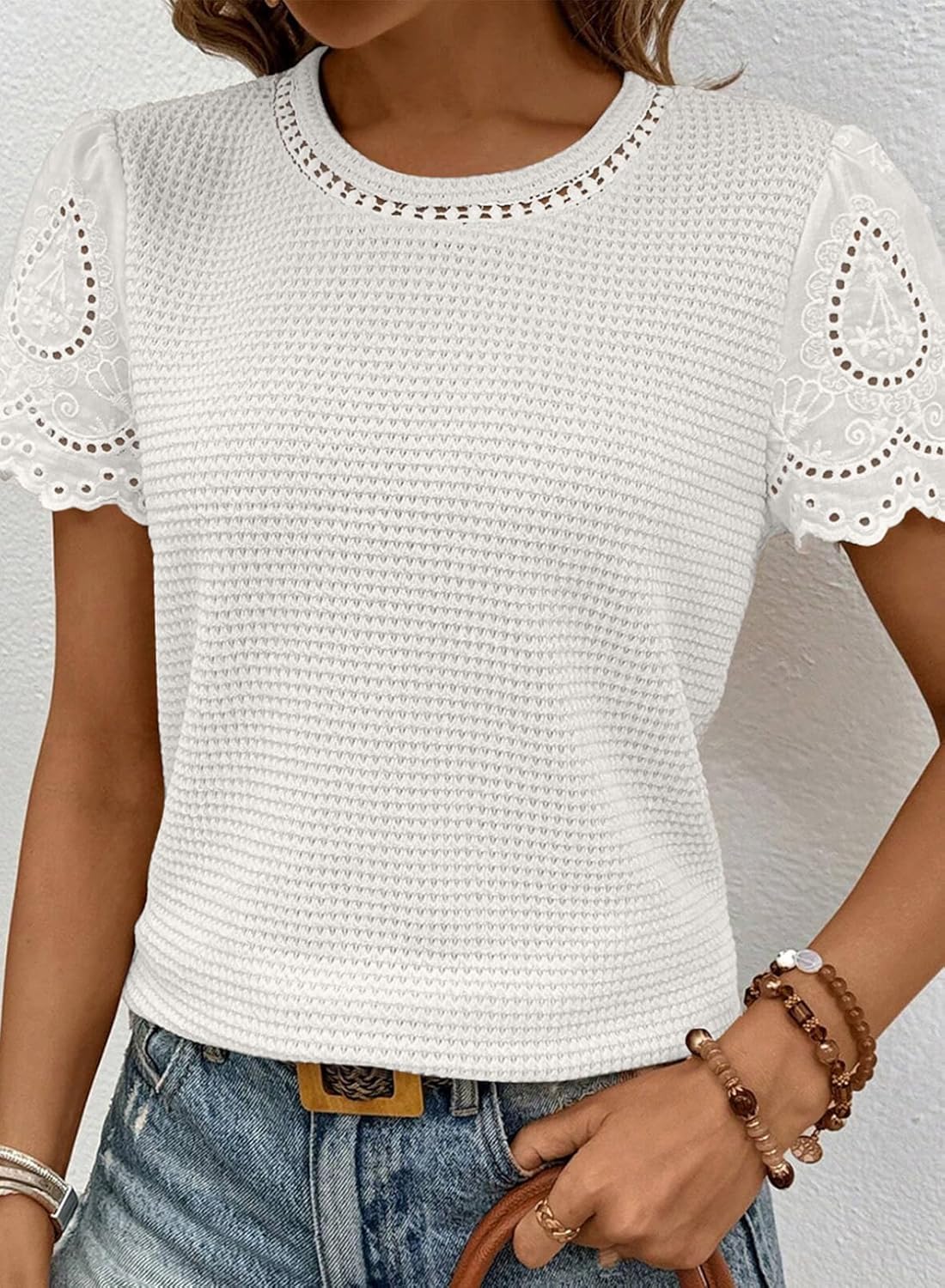 SHEWIN Womens Frenchy Summer Tops Crewneck Short Sleeve T Shirts Casual Waffle Knit Jacquard Blouses Top Shirts