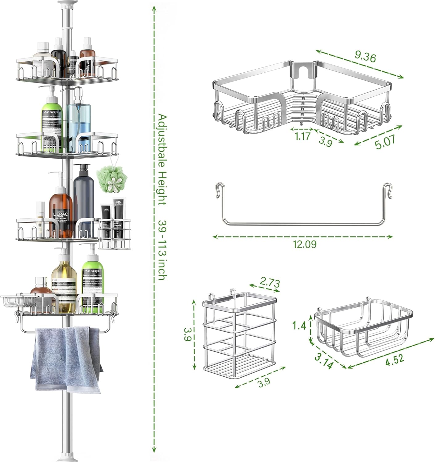 Shower Corner Caddy Tension Pole,Rustproof 4-Tier Bathroom Organizer,Adjustable Standing Shelves for Bathtub Shower Shampoo Storage,39 to 113 Inch,Silver