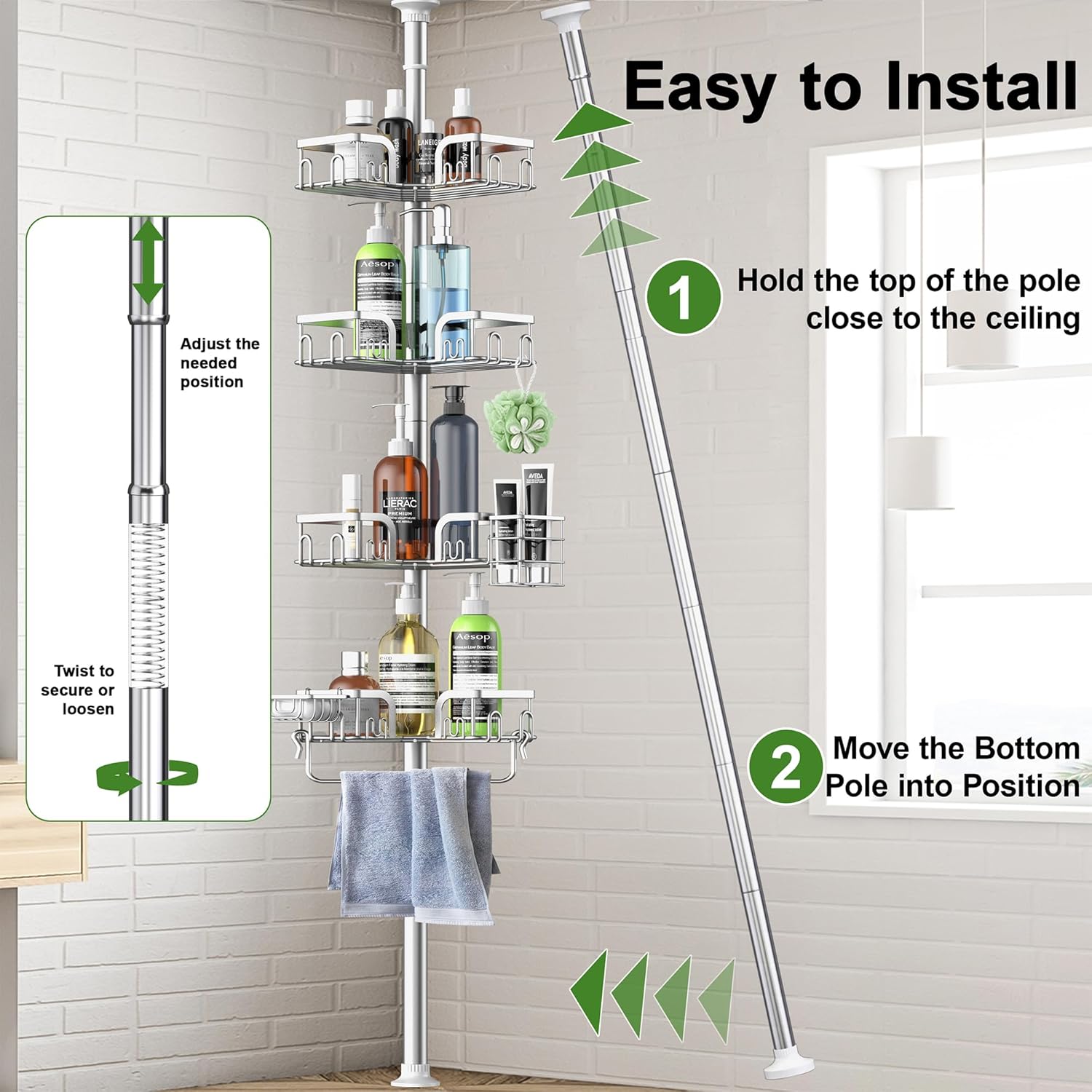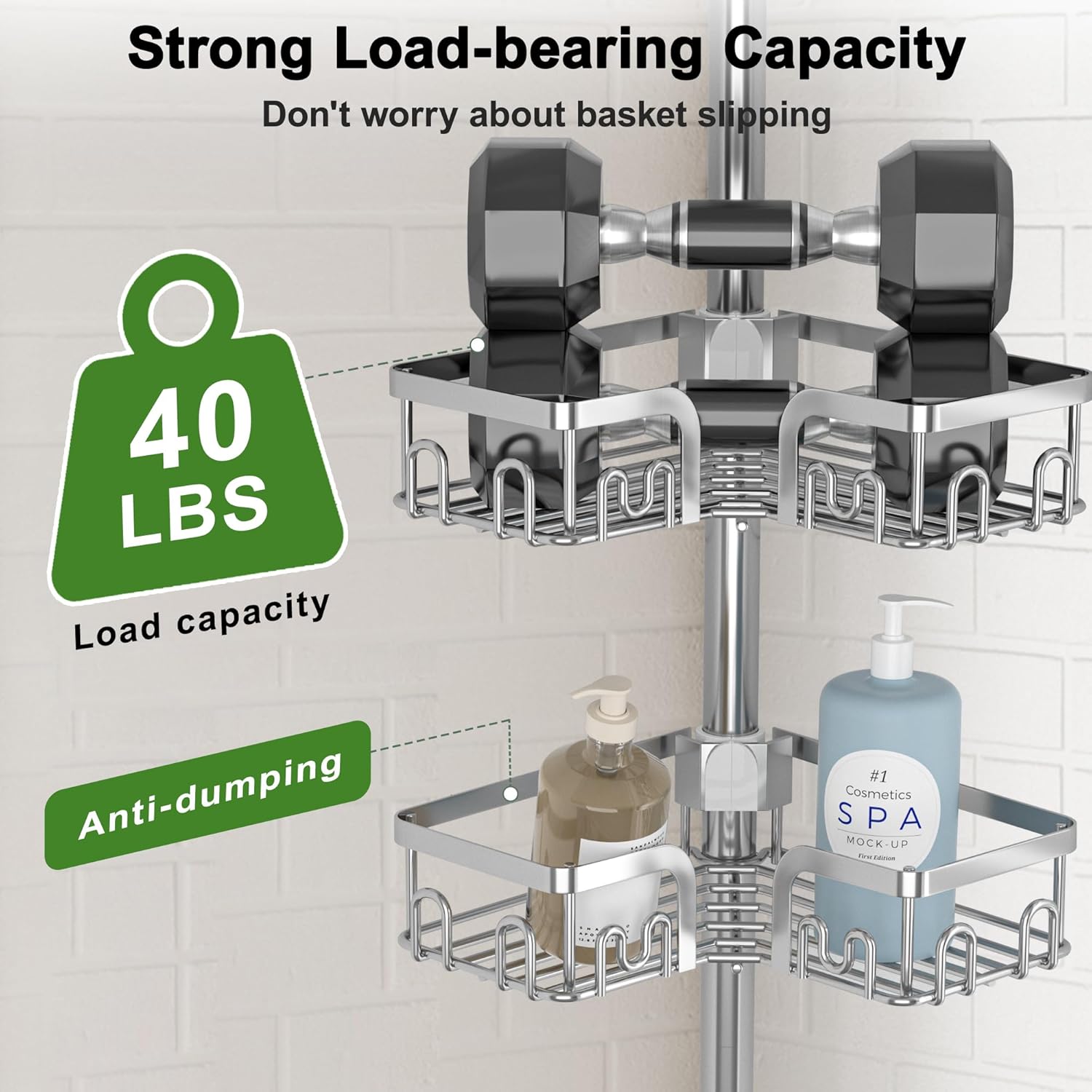 Adjustable Height:Our shower corner shelf is built in a strong spring mechanism,effortlessly take control of the height adjustment of shower pole and basket,Adjusted within a 39 to 113 inches height,Ideal use for bathroom,bathtub and in shower.please note that this corner rack is designed for standard ceilings and not for sloped ceiling