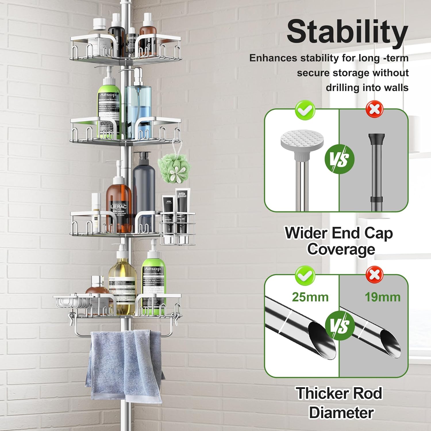 Stability and Durability:The shower shelves adopt a patented clip buckle and hold the basket strongly.Larger non-slip bottom cap provides a secure grip and effectively prevent the shelf from slipping off.Inside powerful spring make the standing shower caddy contacted with the ceiling and floor tightly,Keep the shower caddy tension pole stable,not falling down
