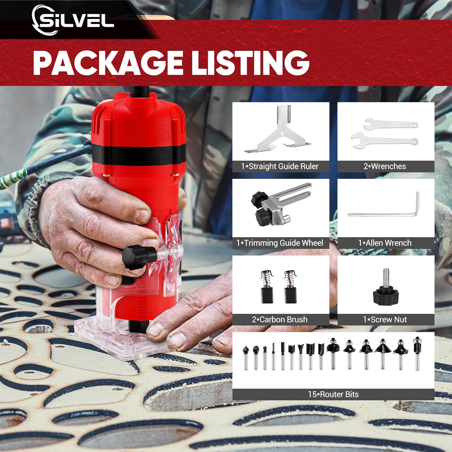 SILVEL Wood Router, 800W Wood Routers for Woodworking, 6.5Amp 1.25HP Hand Wood Router Tool, 30000R/MIN Compact Edge Trimmer with 15 1/4″ Router Bit Set, Red