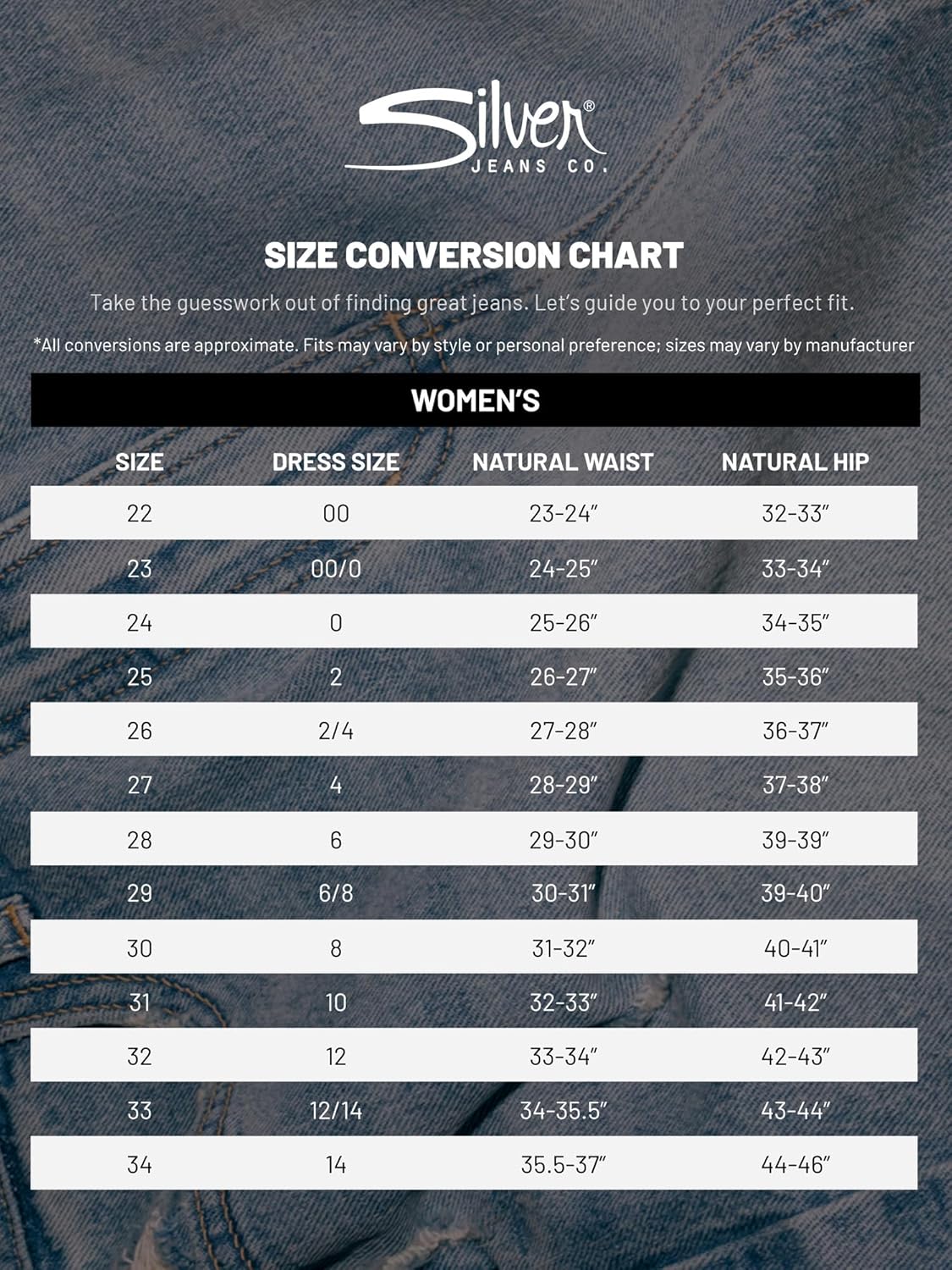 Silver Jeans Co. is more than denim, it’s a legacy of adventure. For 100 years, we’ve been crafting jeans that fit flawlessly, feel comfortable, and look great, empowering you to make every moment a story worth telling. Our denim is a canvas for your stories, accompanying you on any adventure and celebrating your unique journey. When you start in Silvers, every day is an opportunity to express yourself fearlessly.