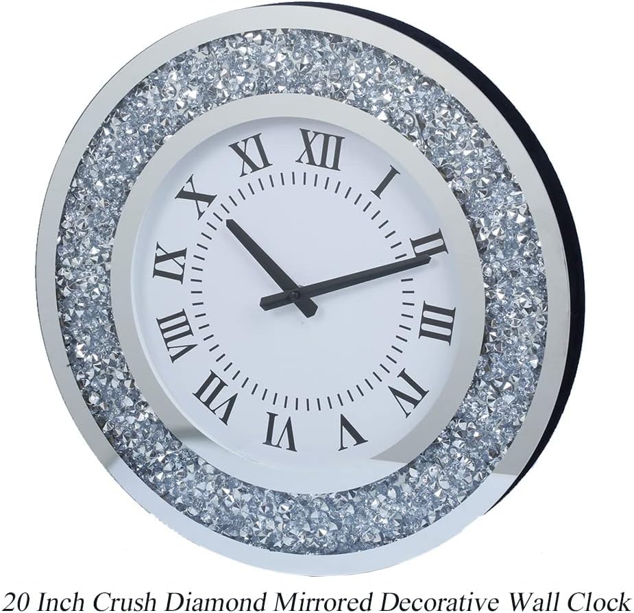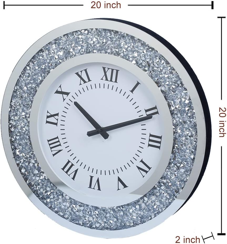 Silver Mirror Clock Crystal Sparkle Twinkle Bling Crush Diamond Mirrored Large Wall Clock for Wall Decoration Silver Glass Mirror Home Décor. AA Battery is not Included. (20 inches-Round)