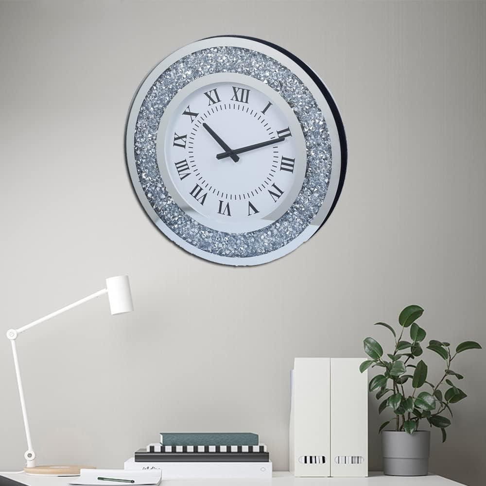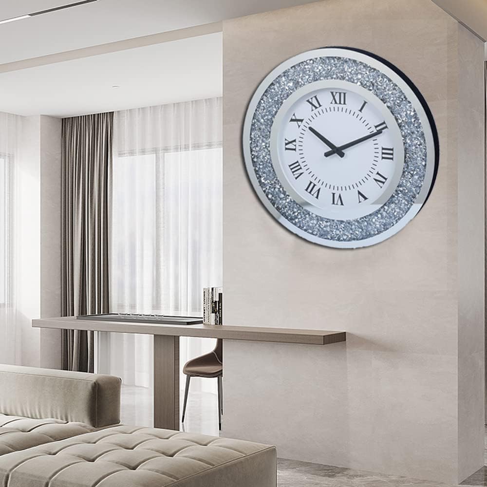 Silver Mirror Clock Crystal Sparkle Twinkle Bling Crush Diamond Mirrored Large Wall Clock for Wall Decoration Silver Glass Mirror Home Décor. AA Battery is not Included.