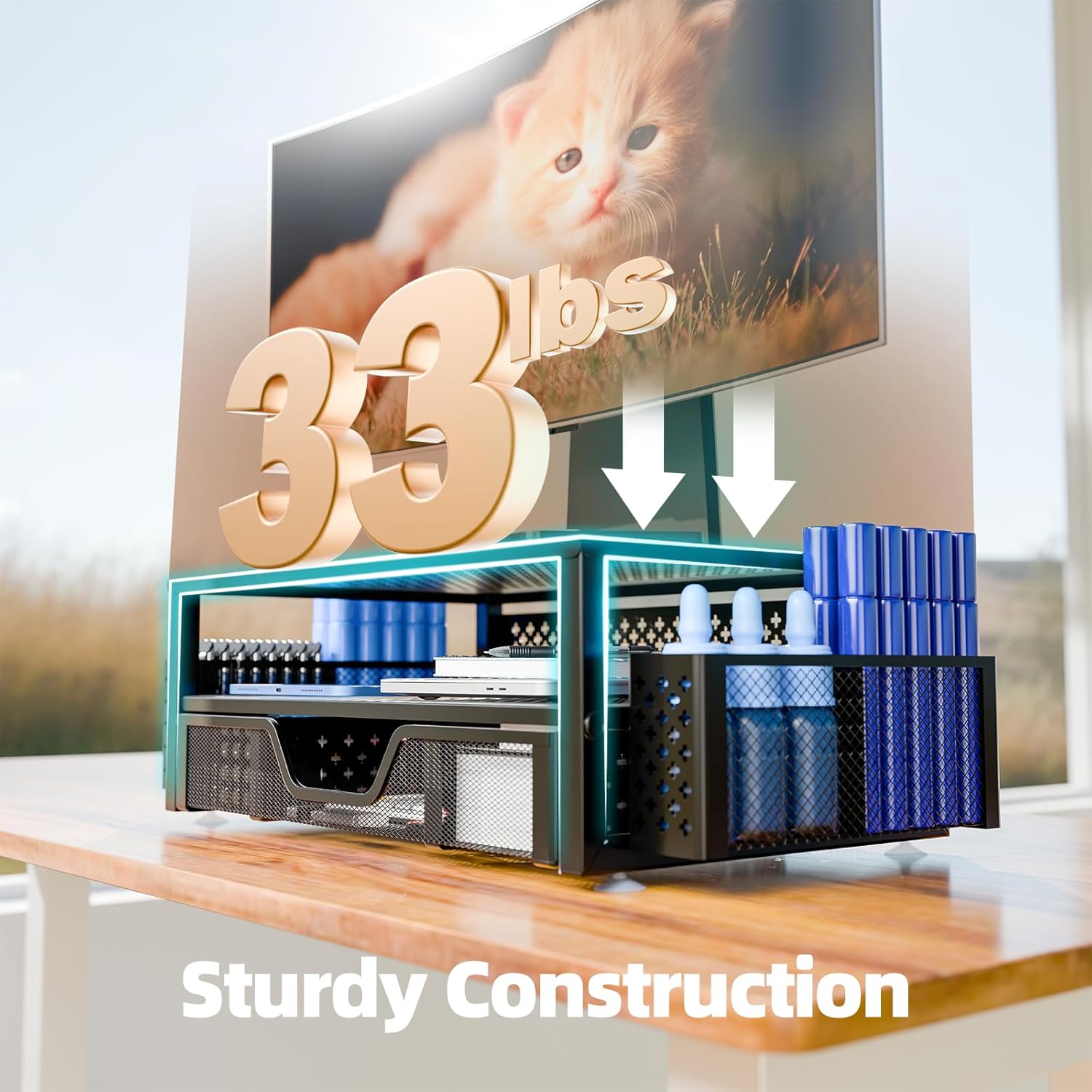 Customers find the monitor stand sturdy enough to support large monitors and easy to assemble, working well for home office setups. The product effectively saves desk space, with drawers and side slots providing ample storage for office essentials. Customers appreciate its functionality, organization capabilities, and sleek design, considering it worth the price.