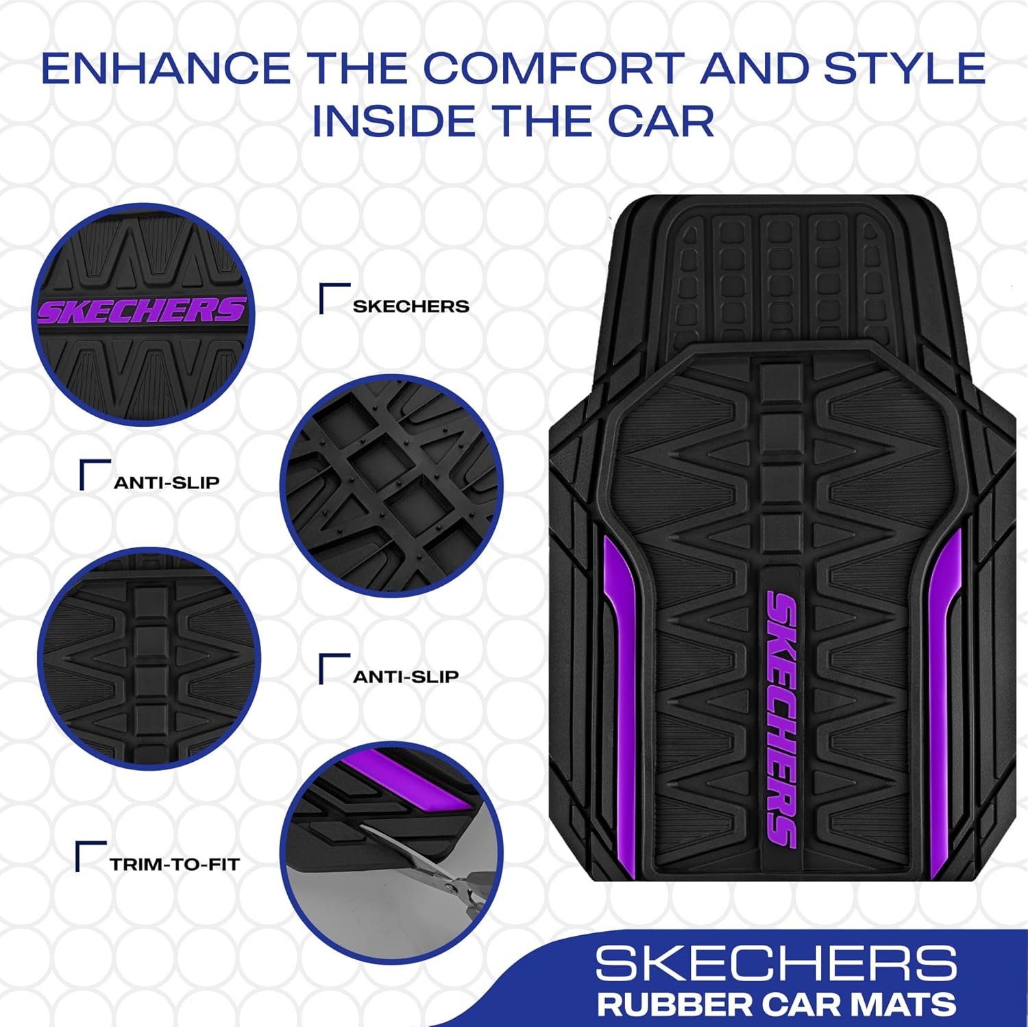CUSTOM FIT DESIGN-Engineered for quick and easy installation, Skechers Floor Mats are designed to fit most cars, trucks, pickups, and SUVs. The flexible universal liners can be easily trimmed with scissors to achieve a precise, custom fit for your vehicle, providing maximum protection and comfort. Enjoy a tailored look and enhanced durability with these adaptable floor mats