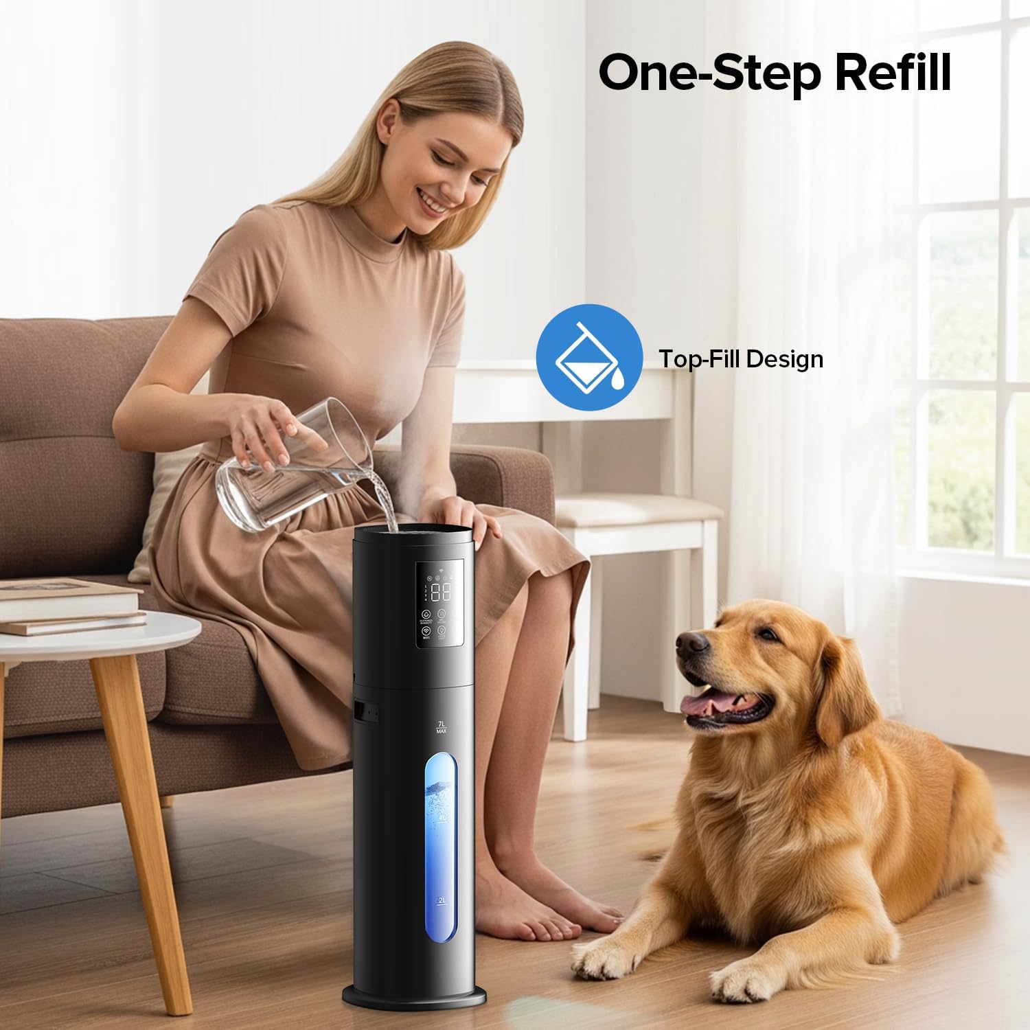 【Humidifier for Bedroom & Convenient Top-Filling】: Experience superior convenience with this 7L large-capacity cool mist humidifier for bedroom. Its innovative top-filling design not only simplifies refilling but effectively prevents leakage. Enjoy up to 60 hours of continuous operation —making it ideal for long-term use. With a powerful 350mL/h moisture output, it efficiently covers areas up to 500 sq. ft., effectively alleviating dry air and skin. Perfect as a whole-house humidifier for your home, living room, or dorm.