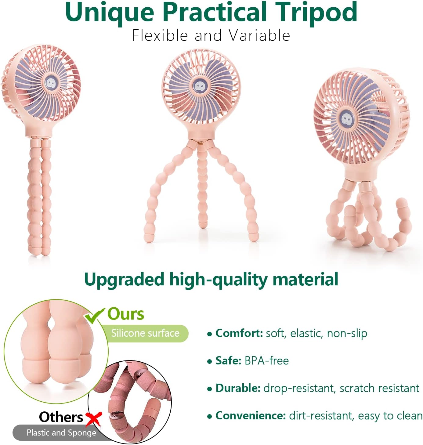 【Upgraded Flexible Unbreakable Tripod】snawowo baby stroller fan has an upgraded tripod which is made of high quality bendable metal and food grade silicone surface instead of the old plastic and sponge surface. so you don’t have to worry about the baby eating it by mistake. The tripod is waterproof, not easy to get dirty and broken, easy to clean, and more anti-wear.