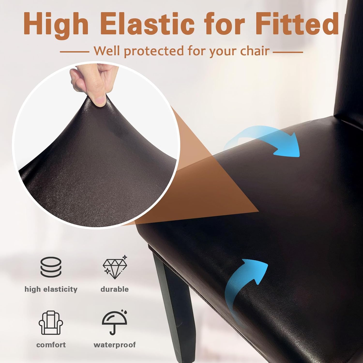 Softer & Elastic Leather: Lufyzora Brown chair covers leather for dining chairs are made from a high-quality faux leather, thickened and high elasticity, allows it to adapt effortlessly to your chairs and quickly recover when stretched. Leather may will has a slight smell when it is first opened, and it will disappear about one day