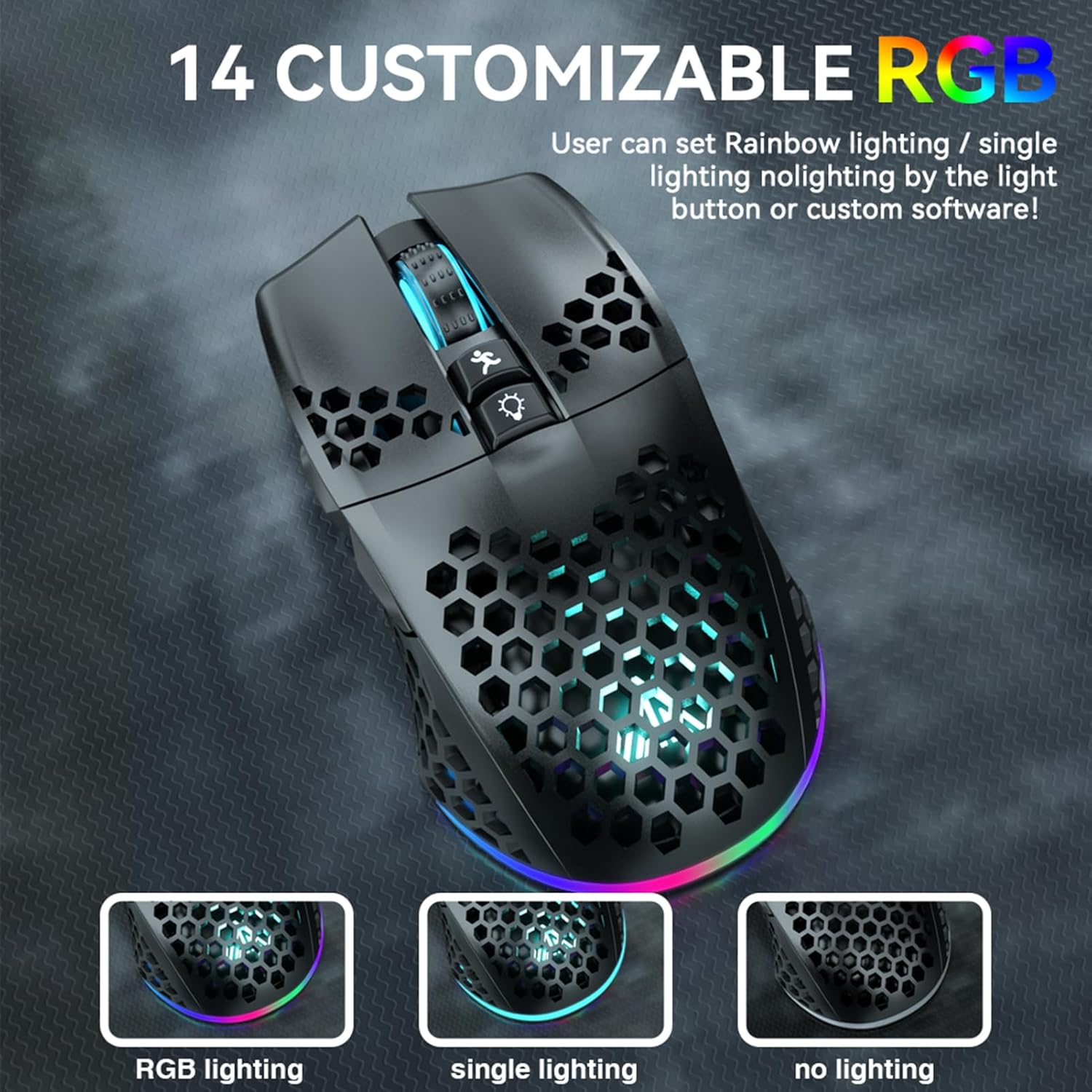 14 RGB Rainbow Backlight:SM600 has beautiful RGB rainbow backlight.This wireless mouse is equipped with RGB lighting effects. Press the top button to switch light modes(rainbow light,Monochrome light,light off). Very cool lights especially when useing in the dark.