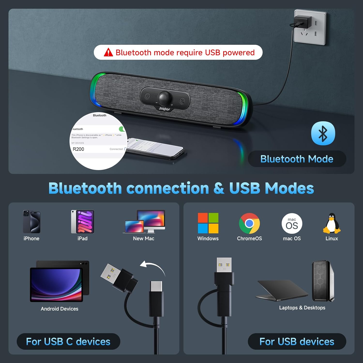 SOULION R200 Bluetooth Computer Speakers, Compact PC Speakers, USB C/USB Plug & Play Desktop Speaker with Colorful LED Lights, Clear Sound Wired PC Soundbar for Computer Desktop Laptop Monitor