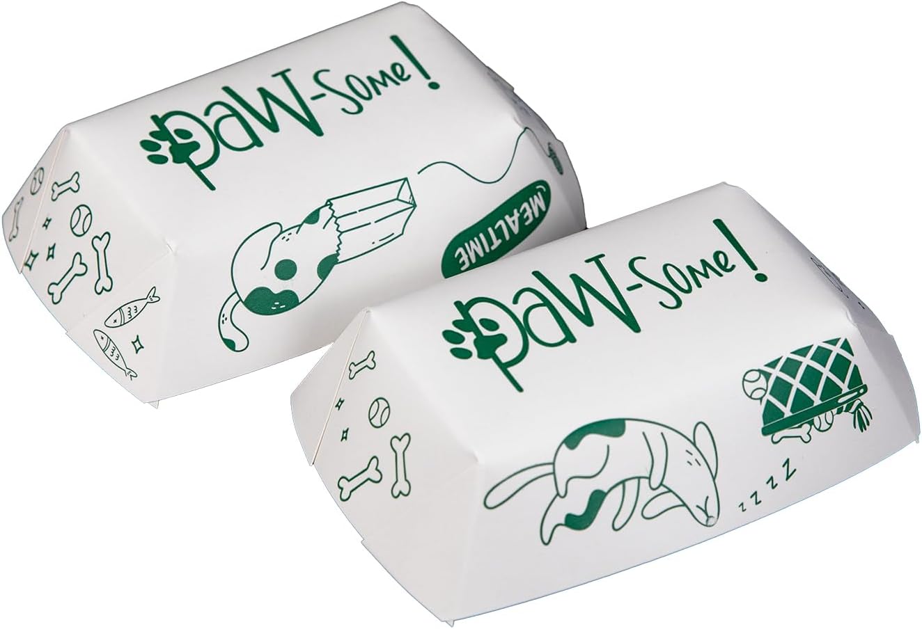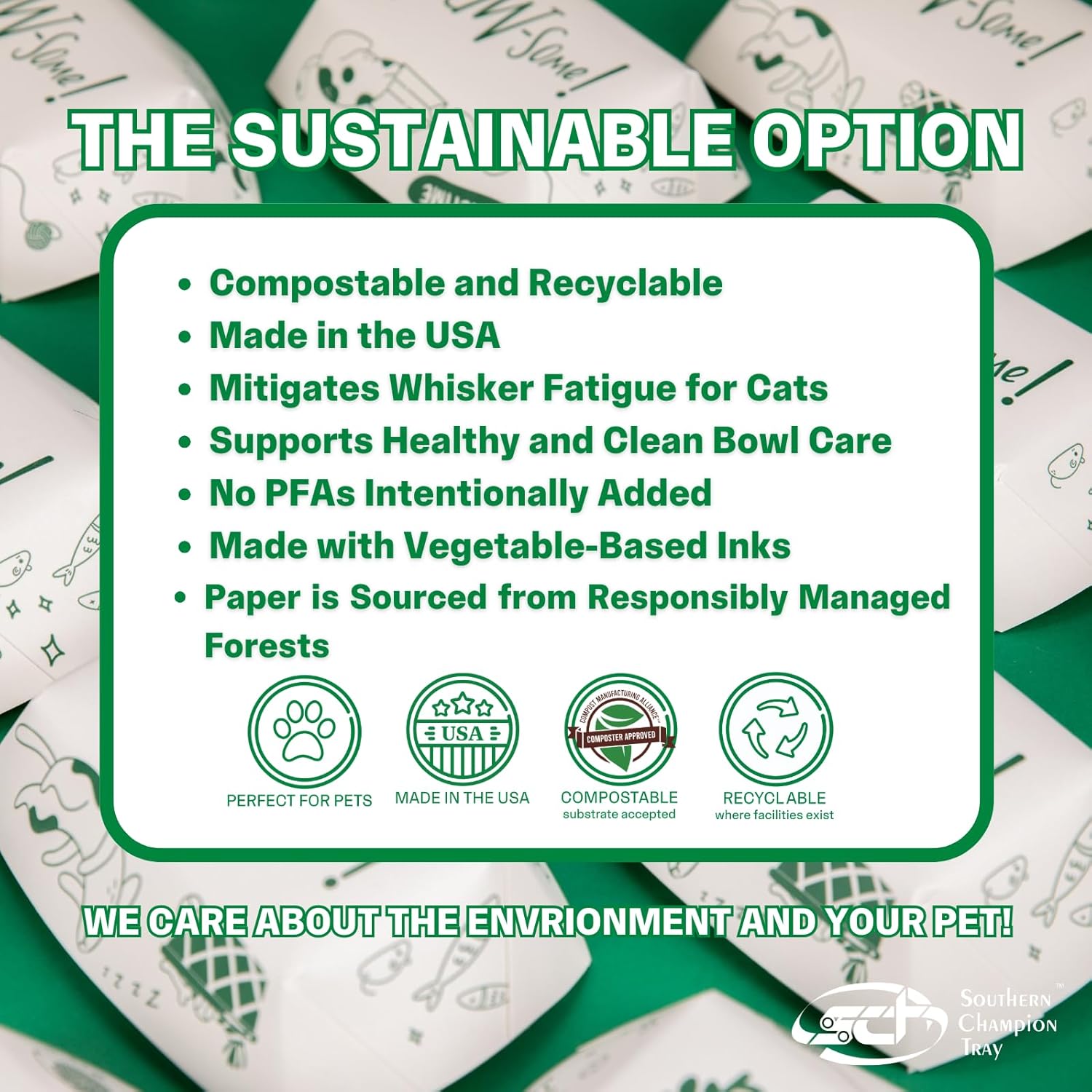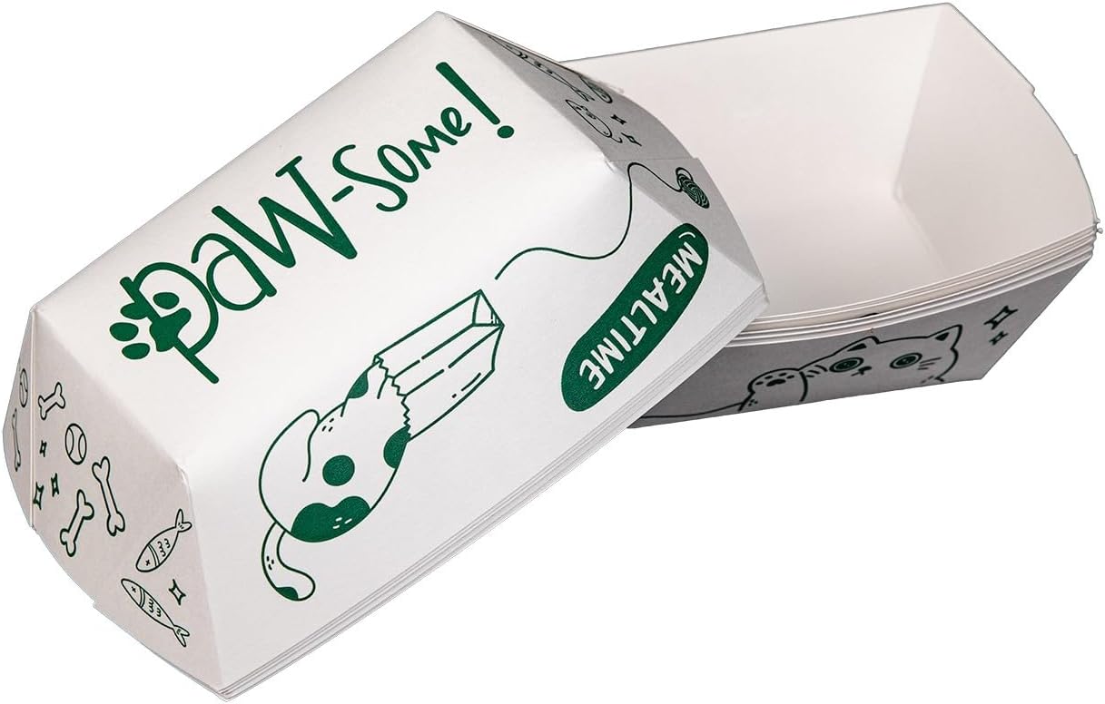 SUSTAINABLE: Made from compostable and materials, our eco-friendly pet food trays, or pet food bowls, let you care for the planet while caring for pets. A perfect choice for clinics and shelters wanting to adopt more sustainable practices. These trays are MADE IN THE USA with water-based inks, and are completely where facilities exist!
