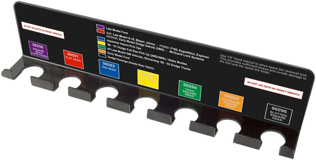 The Steelman 7-Piece Spare Tire Retrieval Tool Kit allows you to remove cradle-suspended spare tires from a variety of vehicles quickly. Each powder-coated, 30-inch long carbon steel tool features a unique head. This versatile set includes a flat head (for late model S10 trucks, Explorers, Blazers, GMCs, F150s, Expeditions, older Dakota 2-wheel drives, and McGuard lock systems), a pin head (for import trucks), a hex head (for Dodge full-size and stake bodies and for 1998-2001 Dodge full-size 4-wheel drive), a 12mm square head (for late model GMs and 1998-2003 Dodge trucks), a standard square head (for older Ford trucks), a slotted square head (for Dodge Durango, inside the hatch), and a 3/8-inch square head (for newer Fords). Each tool has a ⅞-inch hex end that allows you to use a socketed ratchet or combination wrench to drive the tool. The included holding bracket enables you to hand the set on a wall for easy access and convenient storage. For ease of use, a color-coded end on each tool corresponds to the wall bracket’s application chart so you can quickly identify the correct removal tool to do the job. With its rugged durability and productivity-increasing power, this set is a valuable addition to any professional auto mechanic garage.