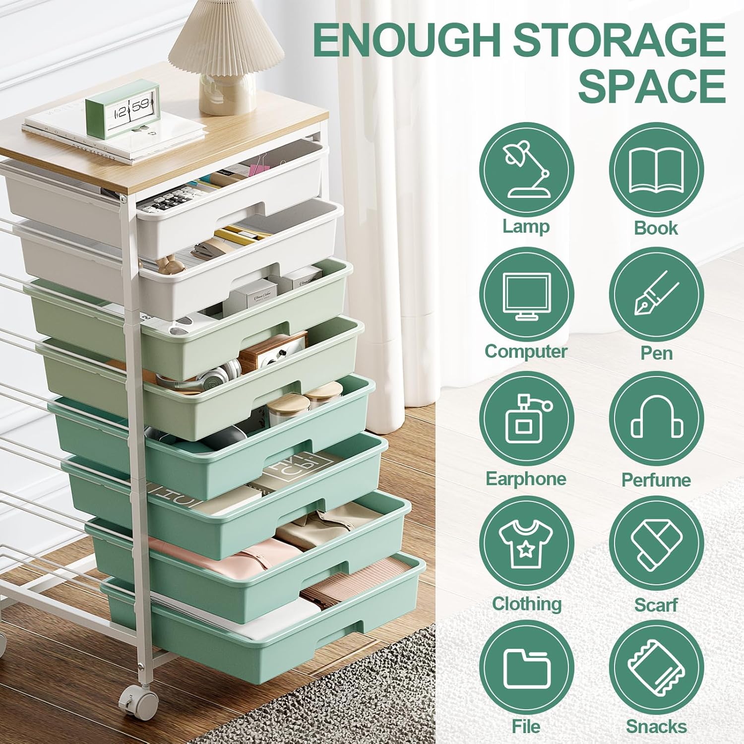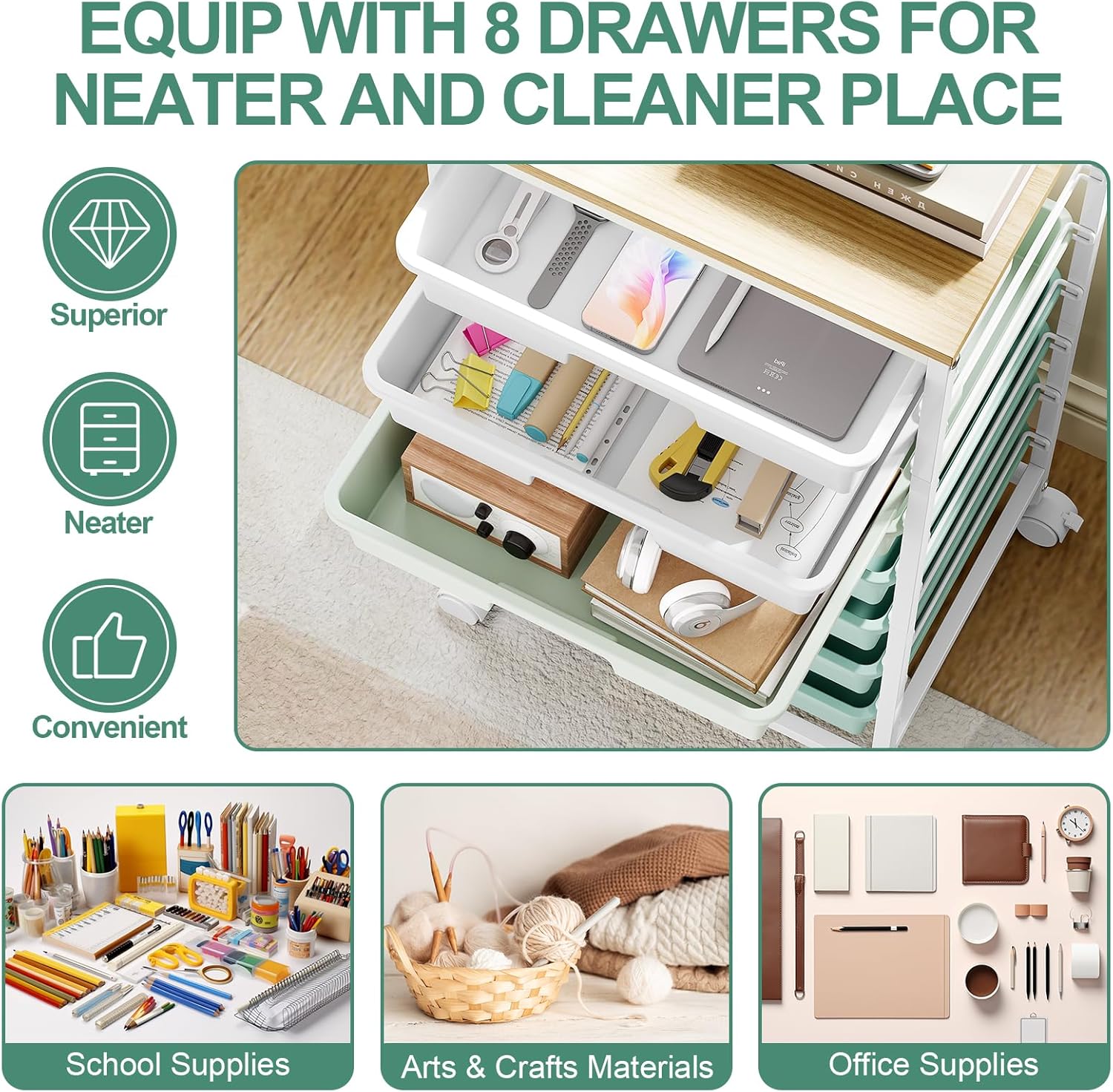 MULTIPLE OCCASIONS: This 8-drawer rolling storage cart is perfect for living rooms, bedrooms, offices, sewing rooms, craft rooms, classrooms, dorms, art studios or homework stations. More drawers are ideal for storing tools, sewing supplies, decorations, school supplies, toys, stationery, office supplies, art and craft materials, and beauty products