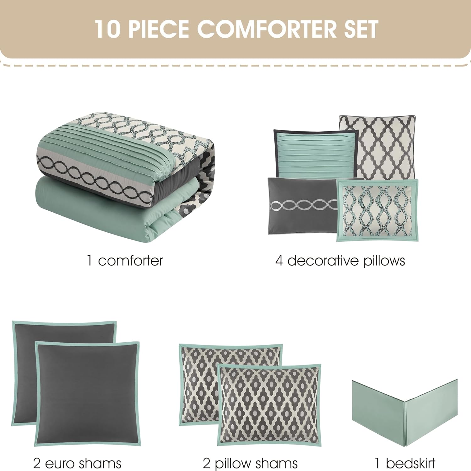 [Set Includes] 1 Comforter, 1 Bedskirt, 2 Pillow Shams, 2 Euro Shams, 4 Decorative Pillows