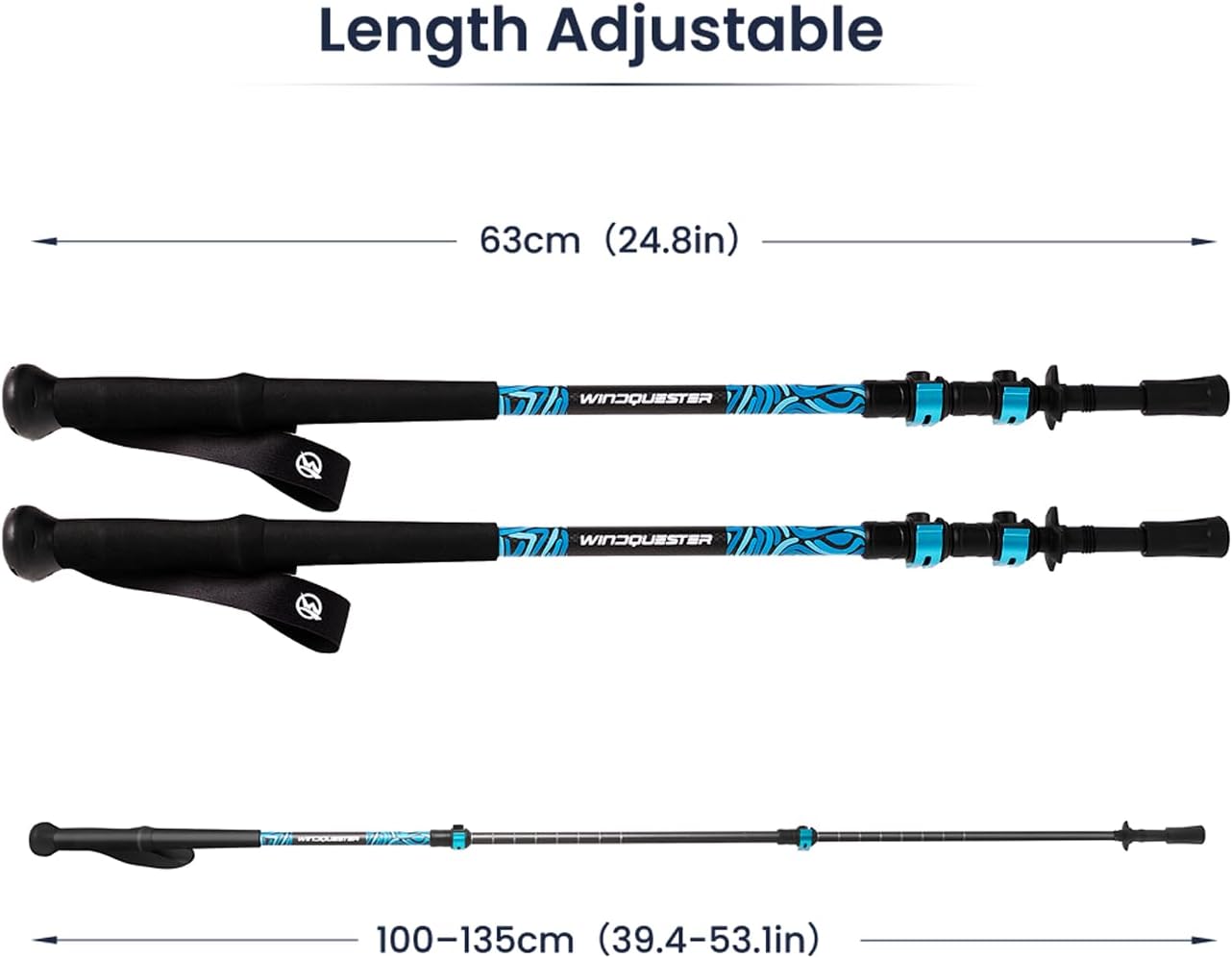Lightweight Carbon Fiber Strength – Crafted from premium carbon fiber, these trekking poles deliver outstanding durability, shock absorption, and a feather-light feel for long-distance hiking