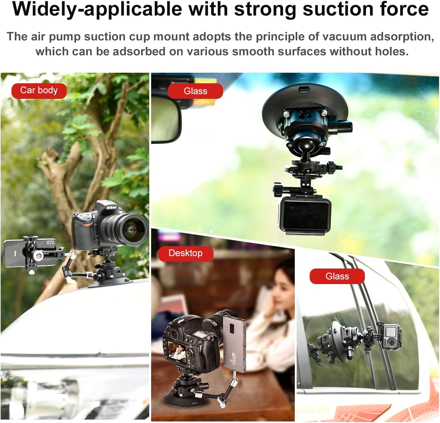 The air pump suction cup mount adopts the principle of vacuum adsorption, which can be adsorbed on various smooth surfaces without holes; Whether it’s flat or curved, such as car body, hull, glass and plastic, etc.
