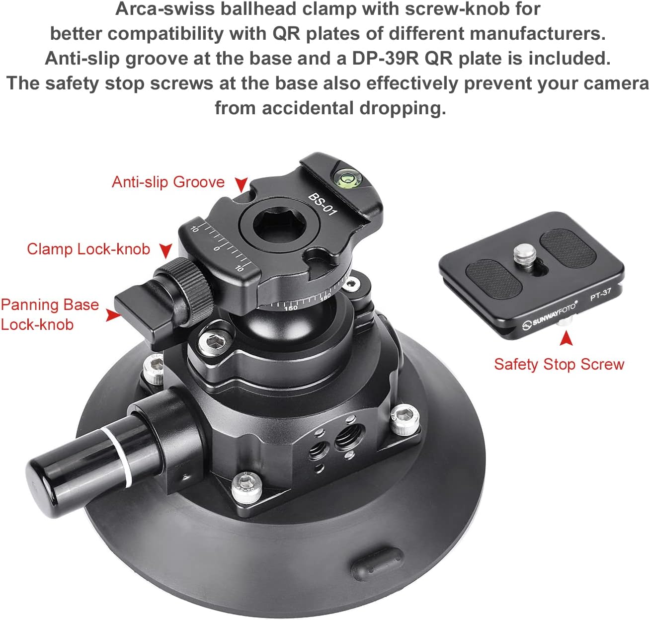 Arca-swiss ballhead clamp with screw-knob for better compatibility with QR plates of different manufacturers. Anti-slip groove at the base and a PT-37 QR plate is included. The safety stop screws at the base also effectively prevent your camera from accidental dropping.