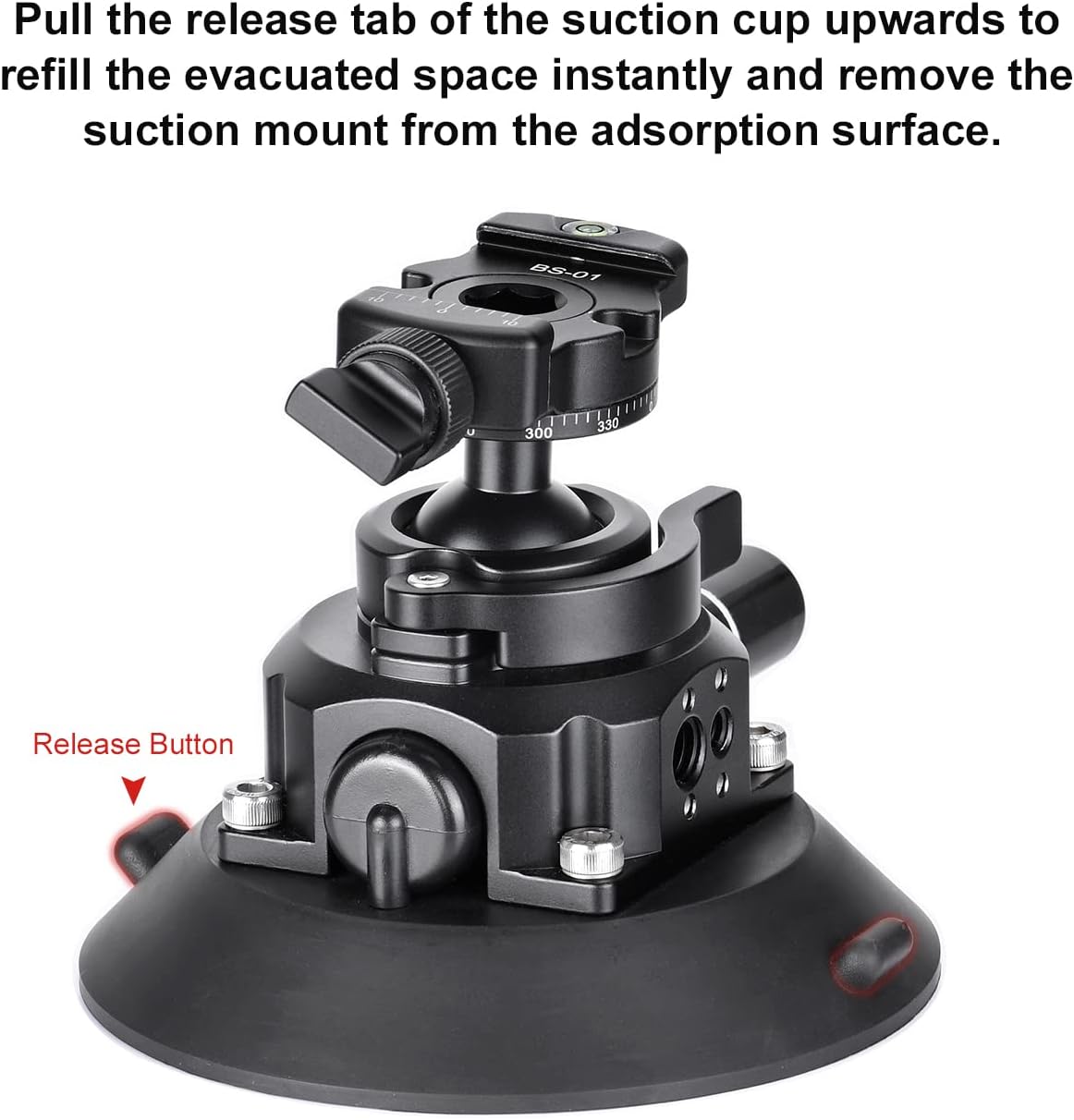 BS-01 is a one-piece vacuum pump suction mount with ball joint, consisting of air pump holder at the base and a ball joint on the top. Compared to its competitors, the BS-01 is more multifunctional, safer and easier to use