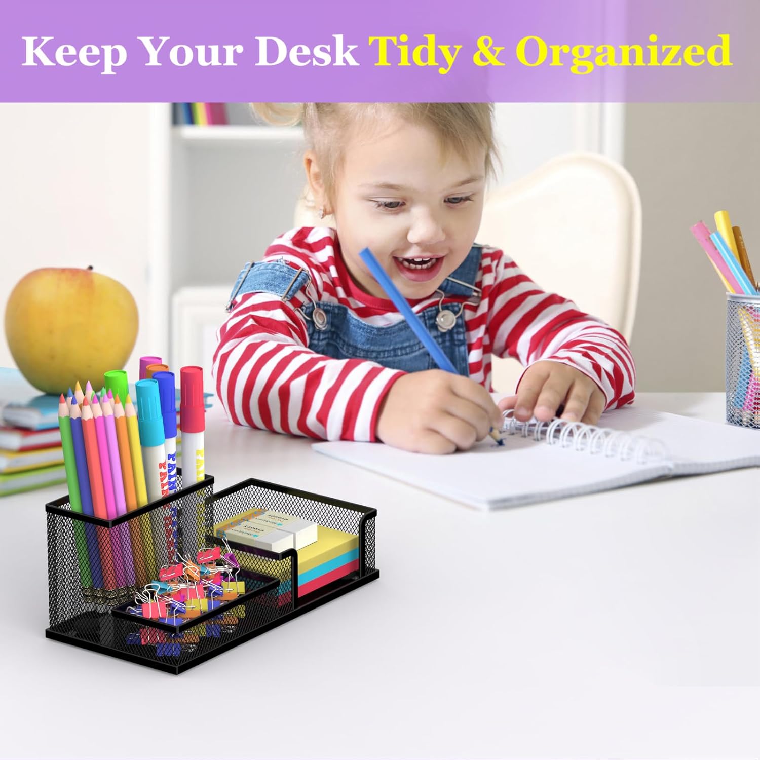Our pencil holder includes 3 compartments which let you separate pens, scissors, rulers, glue sticks and sticker dots, tacks.This product keeps your desk tidy and clutter-free, ensuring quick access to all your essential tools whenever needed.