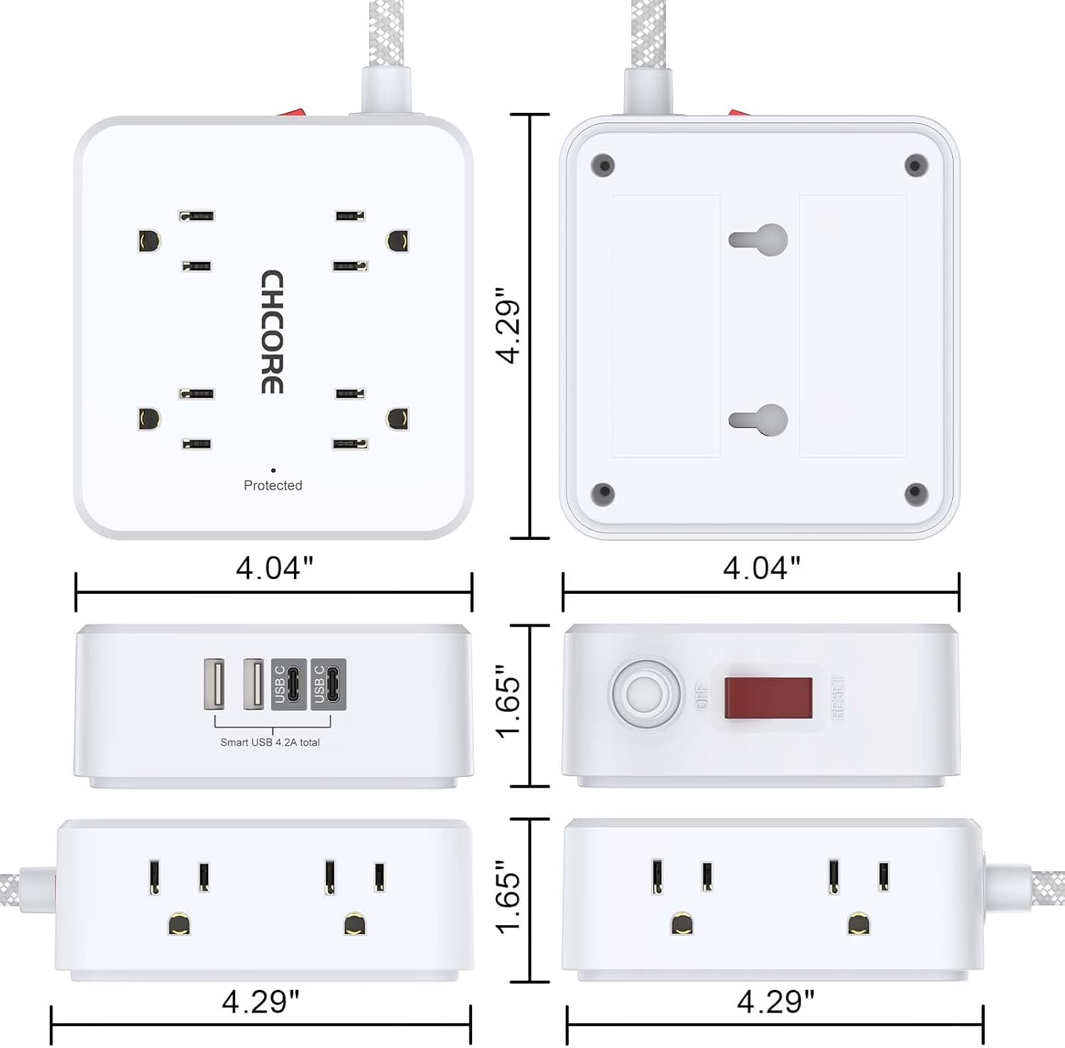 Surge Protector Power Strip – CHCORE 5Ft Braided Extension Cord with 8 Outlets with 4 USB (2 USB C) Charging Ports, Flat Plug Multi Plug Outlet Extender Charging Station for Home Office, ETL, White