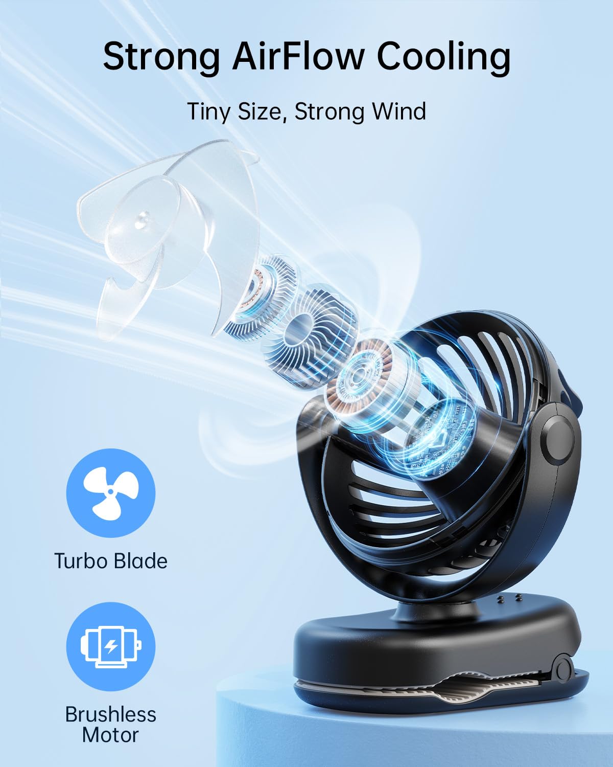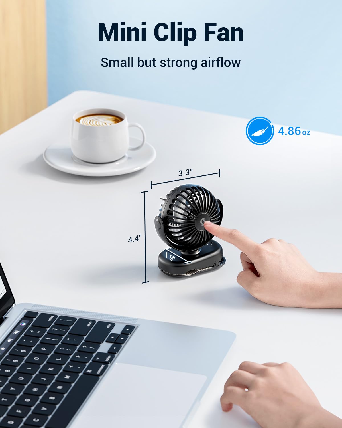 Compact & Space-Saving Design: With dimensions of 4.4″x3.3″x2.3″ and a lightweight 4.86 oz, this mini clip-on fan fits anywhere. Its rounded clip edges ensure safe handling, free from sharp burrs.