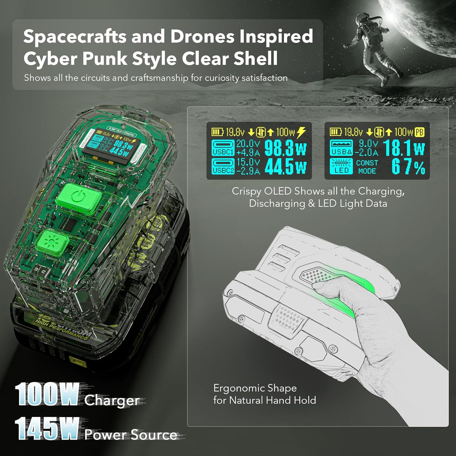 Ideal Working Partner: This battery charger power source for ryobi cordless tool battery adopts an ergonomic design and is comfortable to hold, exquisite and stylish appearance (perfect match with the battery), OLED shows all the charging /discharging /led light data, external LED light for enhanced visibility, multiple advanced options. A great companion for your power tools