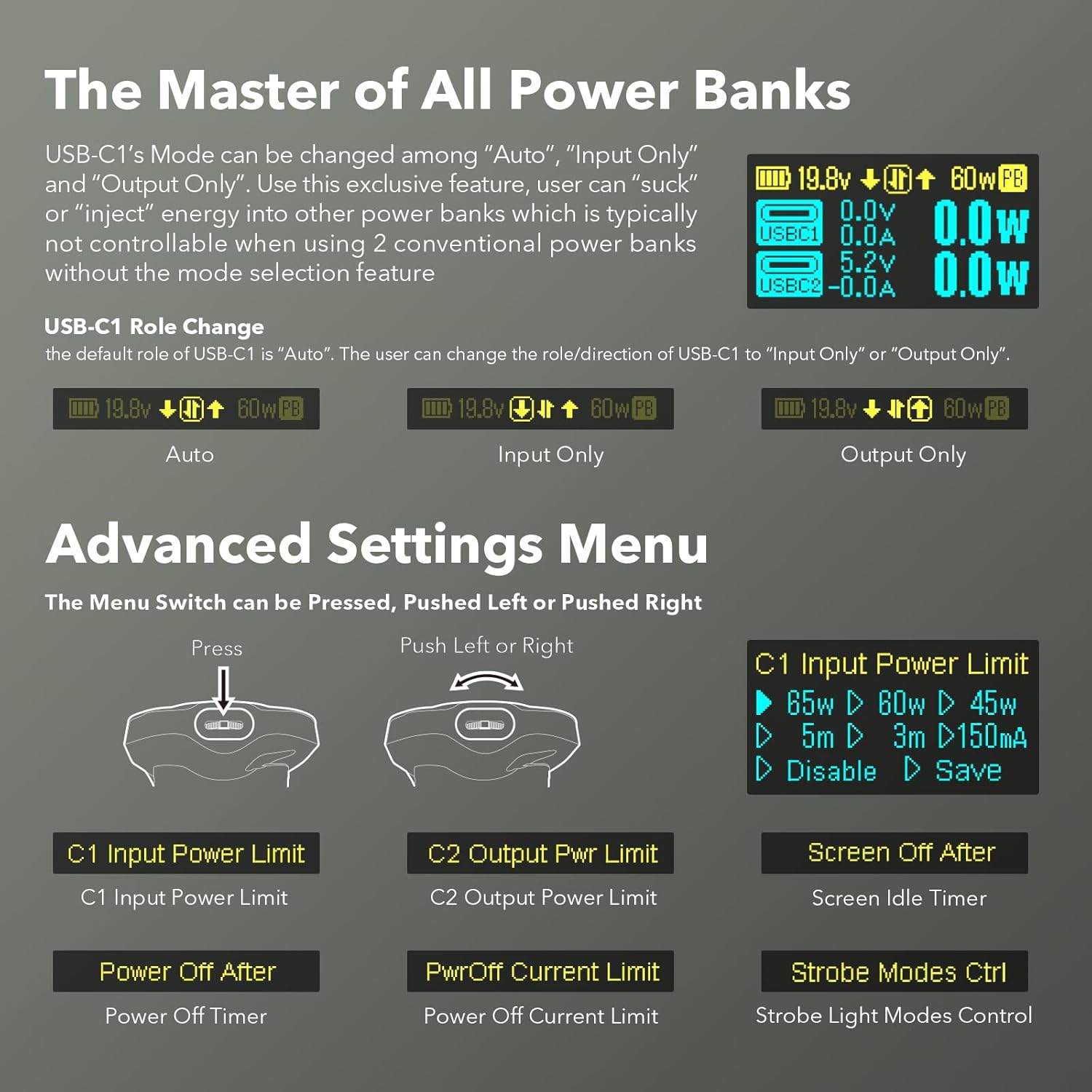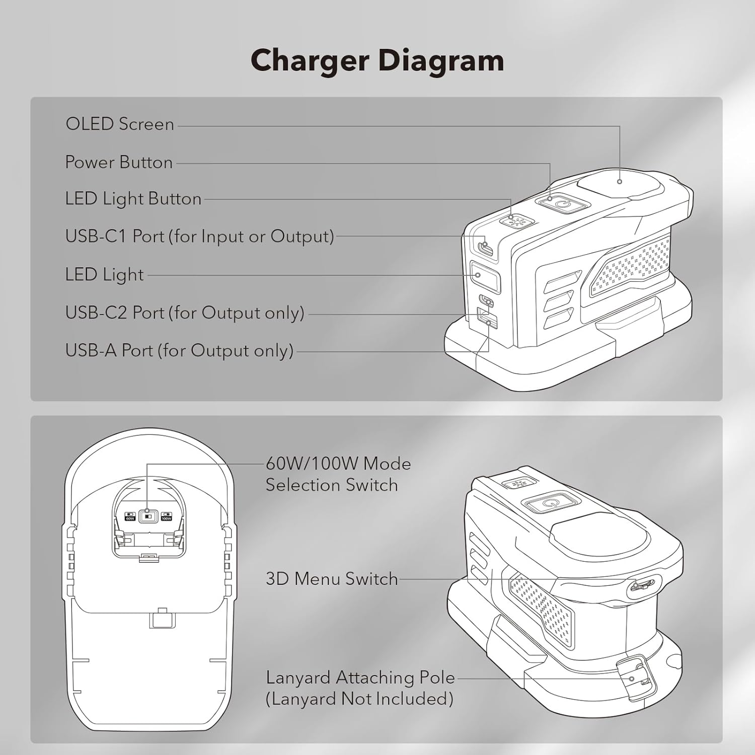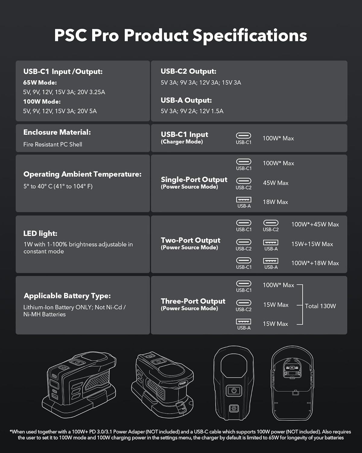100W Super-Fast Charging: USB-C1 port provide two charging modes for you to choose: 60W (65W Max, 5V 3A – 20V 3.25A) and 100W (100W Max, 5V 3A – 20V 5A). Note: Applicable for Lithium-Lon Battery ONLY; Not for Ni-Cd /Ni-MH Batteries
