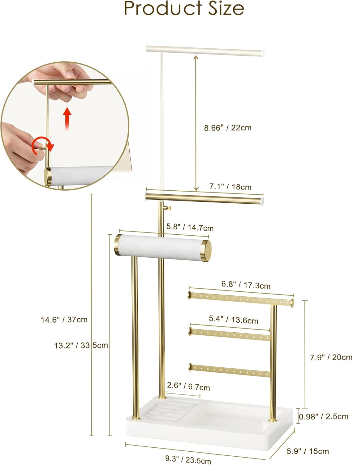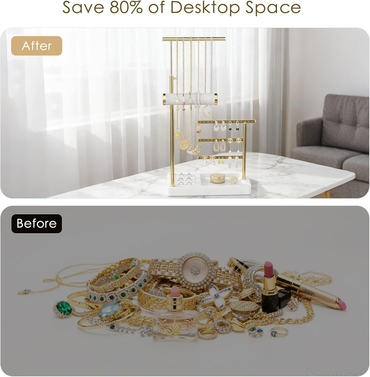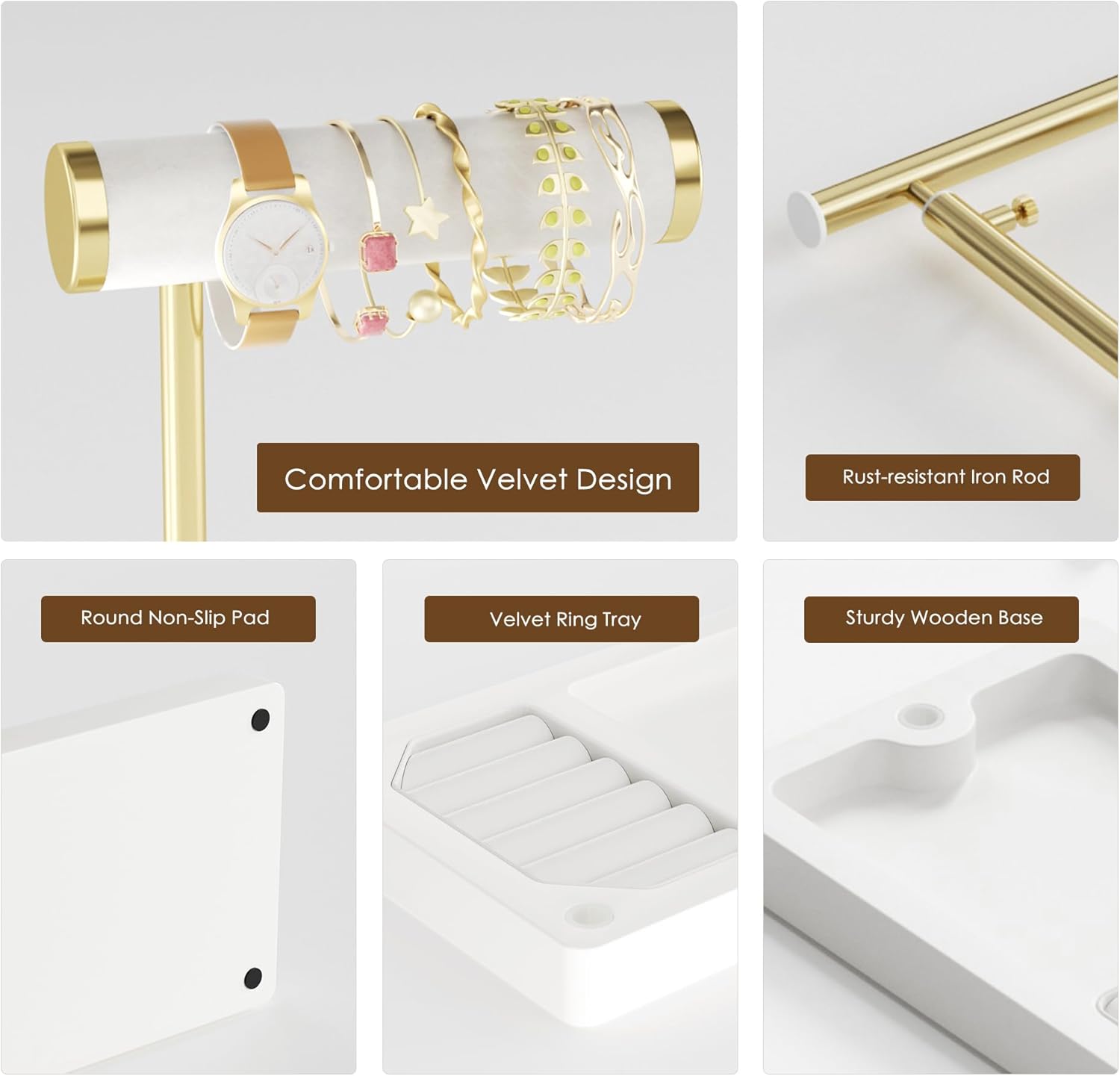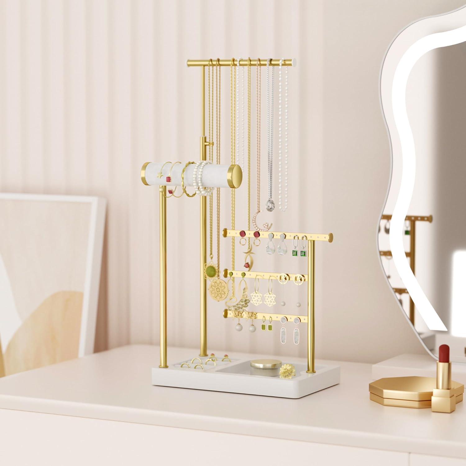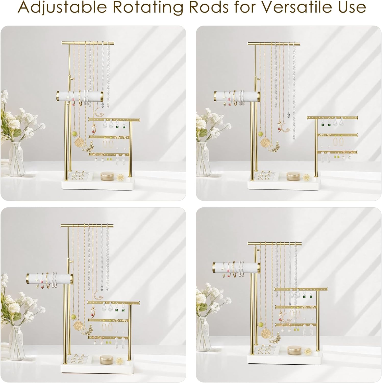 Exquisite Design & Premium Materials: The staggered gold-plated metal rods create a beautiful layered effect, allowing jewelry to be clearly visible at a glance without rummaging through piles. The non-slip base provides strong support, preventing tipping and ensuring jewelry stays secure.