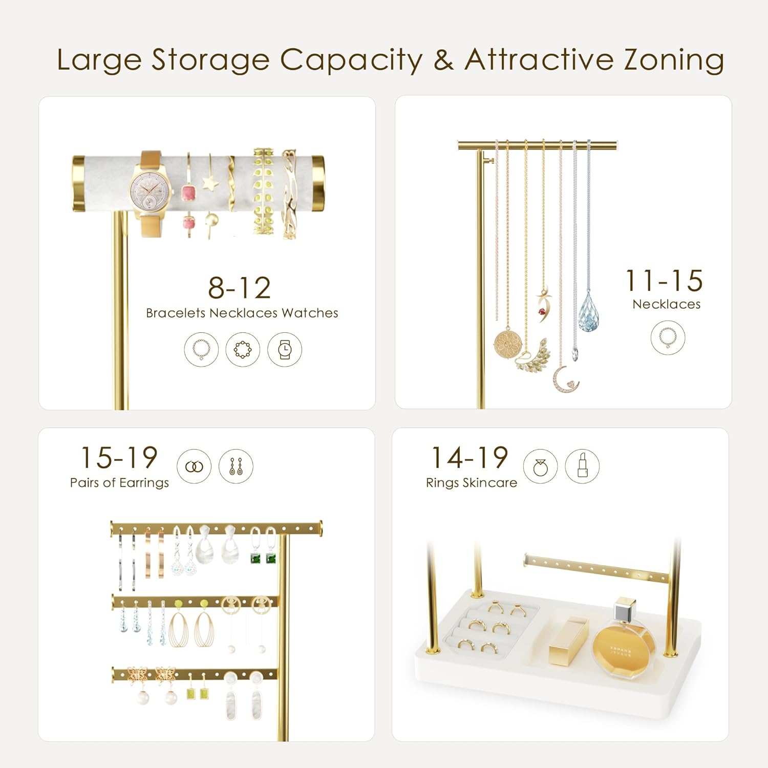 Upgraded Design: The necklace holder offers free rotation and height adjustment for personalized use. Both the bracelet holder and ring tray are lined with velvet fabric, elevating the overall texture. Each tier of the three-tier earring rack features small holes designed to hold 15 to 19 pairs of earrings.