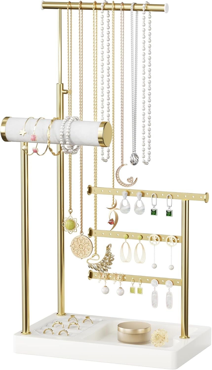 SZQINJI 5 Tier Jewelry Holder Organizer, Gold Jewelry Stand with Velvet Bracelet Holder, Adjustable Height Jewelry Display for Necklaces, Bracelets, Earrings, Rings, Gift Idea for Women, White
