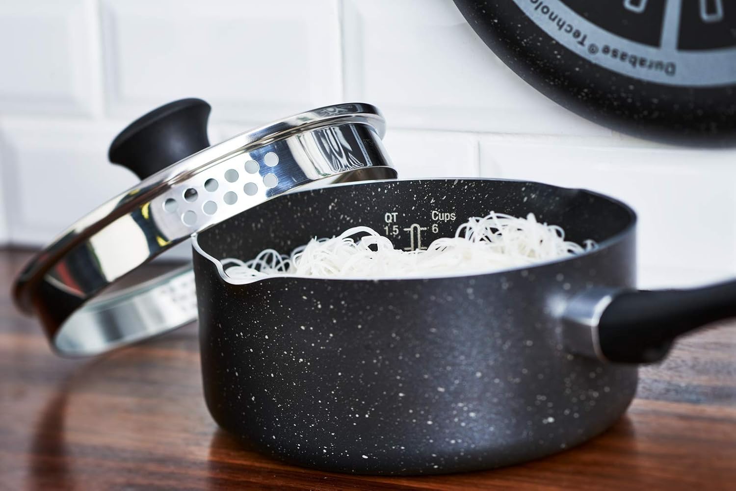 Durable stone-effect cookware: T-fal’s Signature range is made from lightweight, resilient aluminum for excellent heat conductivity and finished with a non-stick stone-effect coating for easy cleanup! Featuring an extra-resistant, metal utensil-safe coating reinforced with mineral and titanium particles, these pans are made to last. And the non-stick stone-effect finish looks great, too!