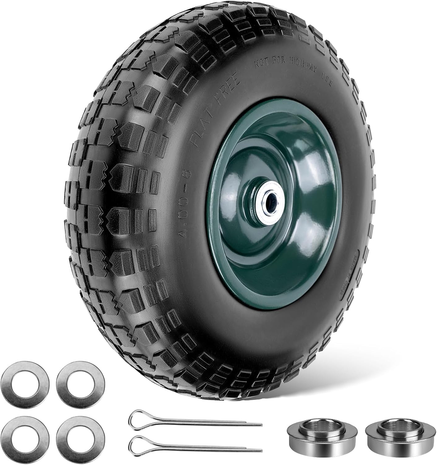 Specifications & Applicable Models: 4.00-6 air less rubber tire and wheel Diameter of Wheel: 13”, Iron hub dia.: 6.73”, Width: 3.4” , Bearings: 5/8″ and 3/4”, Offset Hub Length: 2.2″. Product Marked Load Capacity: 275 lbs/wheel, Maximum Load Capacity: 400 lbs/wheel. Suitable for wheelbarrow, hand truck, trolley, boat dolly, garden utility wagon, garden scooter, hose reel cart,etc.