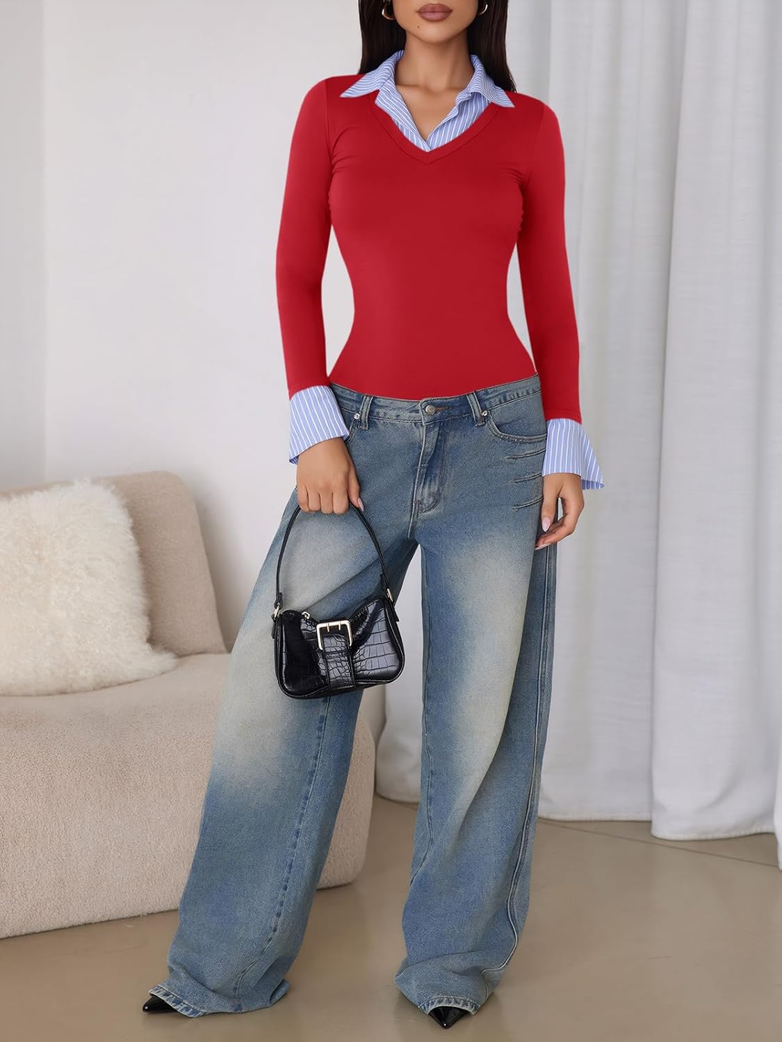 Tankaneo Womens Long Sleeve Polo Shirts Business Casual Work Tops Slim Fit V Neck Collared Patchwork Fall Outfits