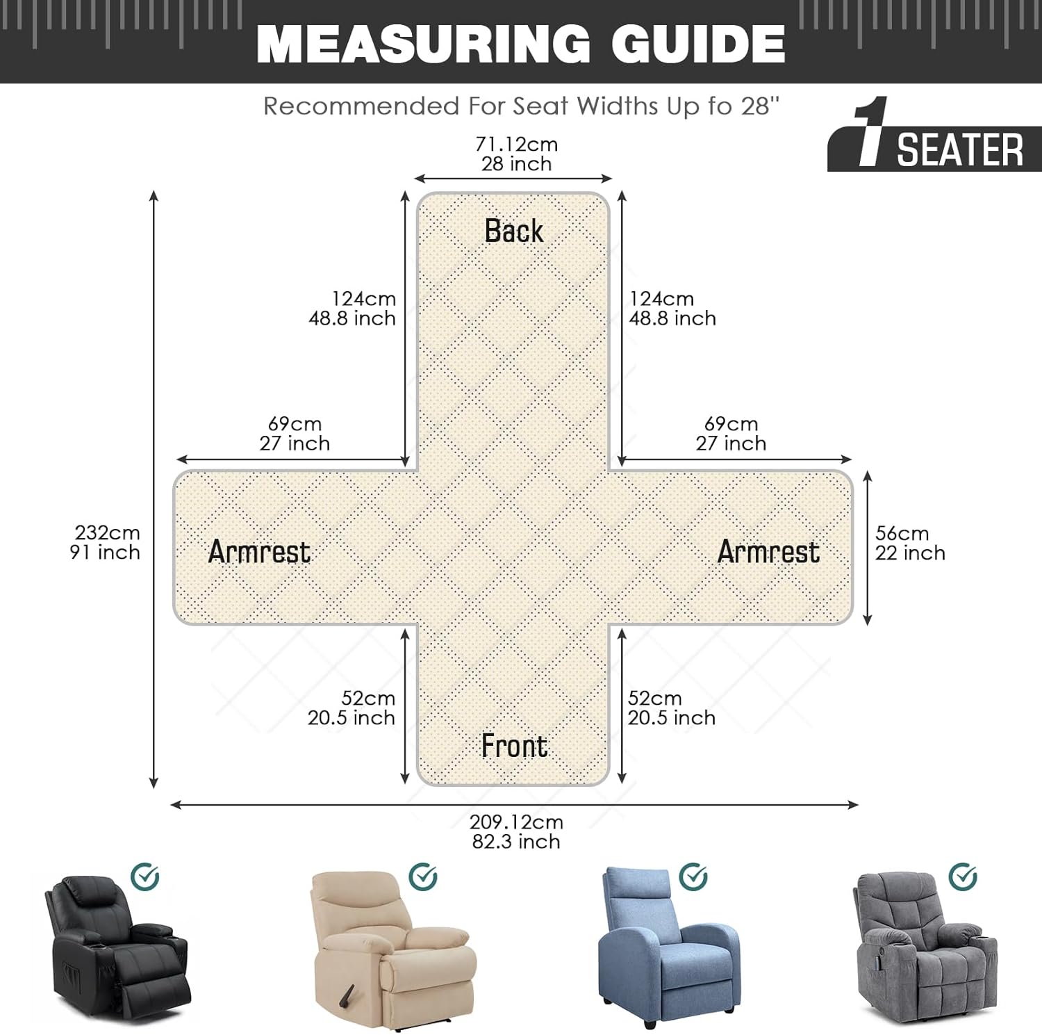 【DIMENSIONS GUIDE】 There are two sizes of sofa slipcovers available that will fit most family furniture. Large pet recliner covers fit a chair with a seat width of 28 in, see measurement guide in photos. NOTE: Please confirm the size before purchasing