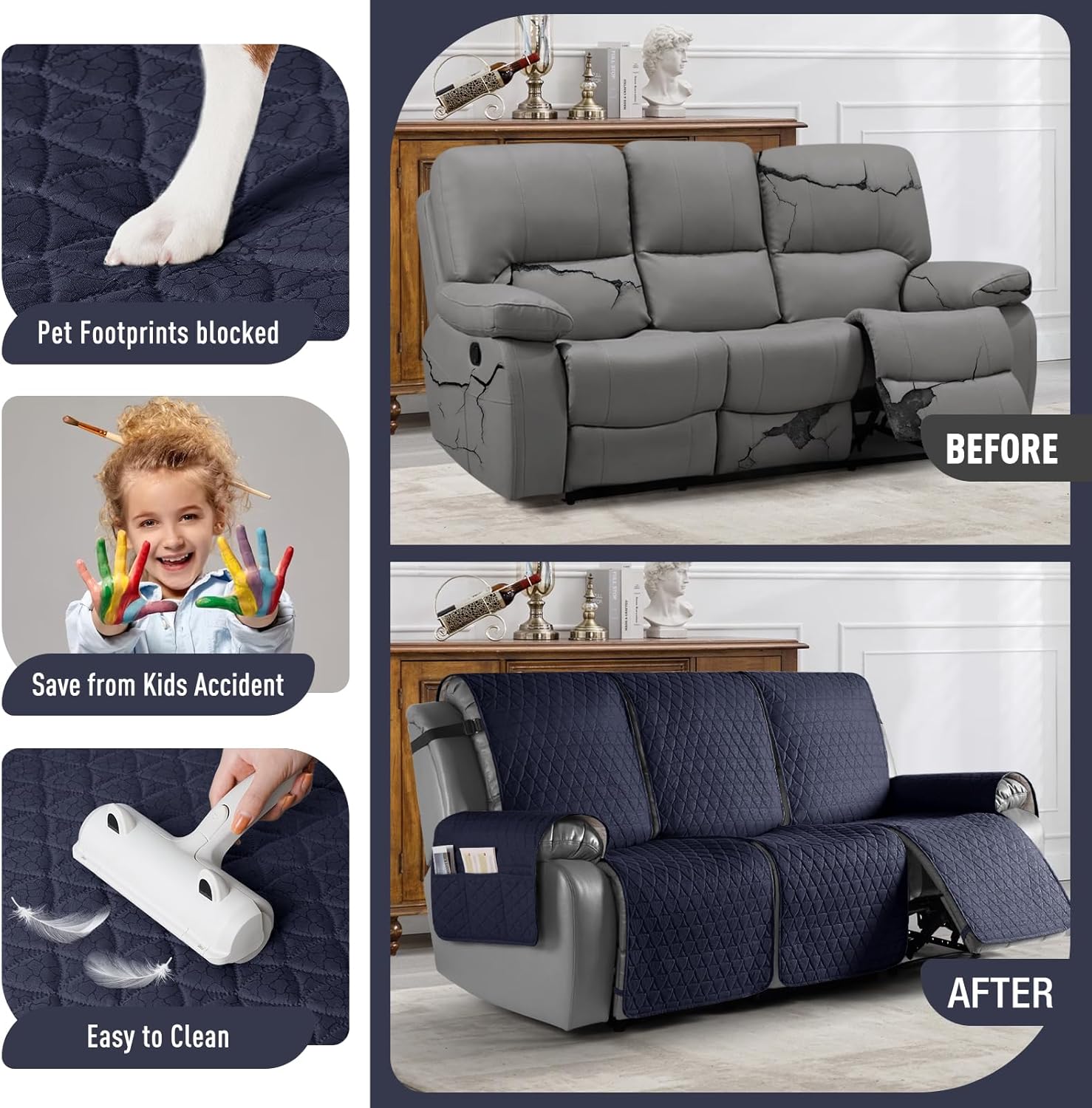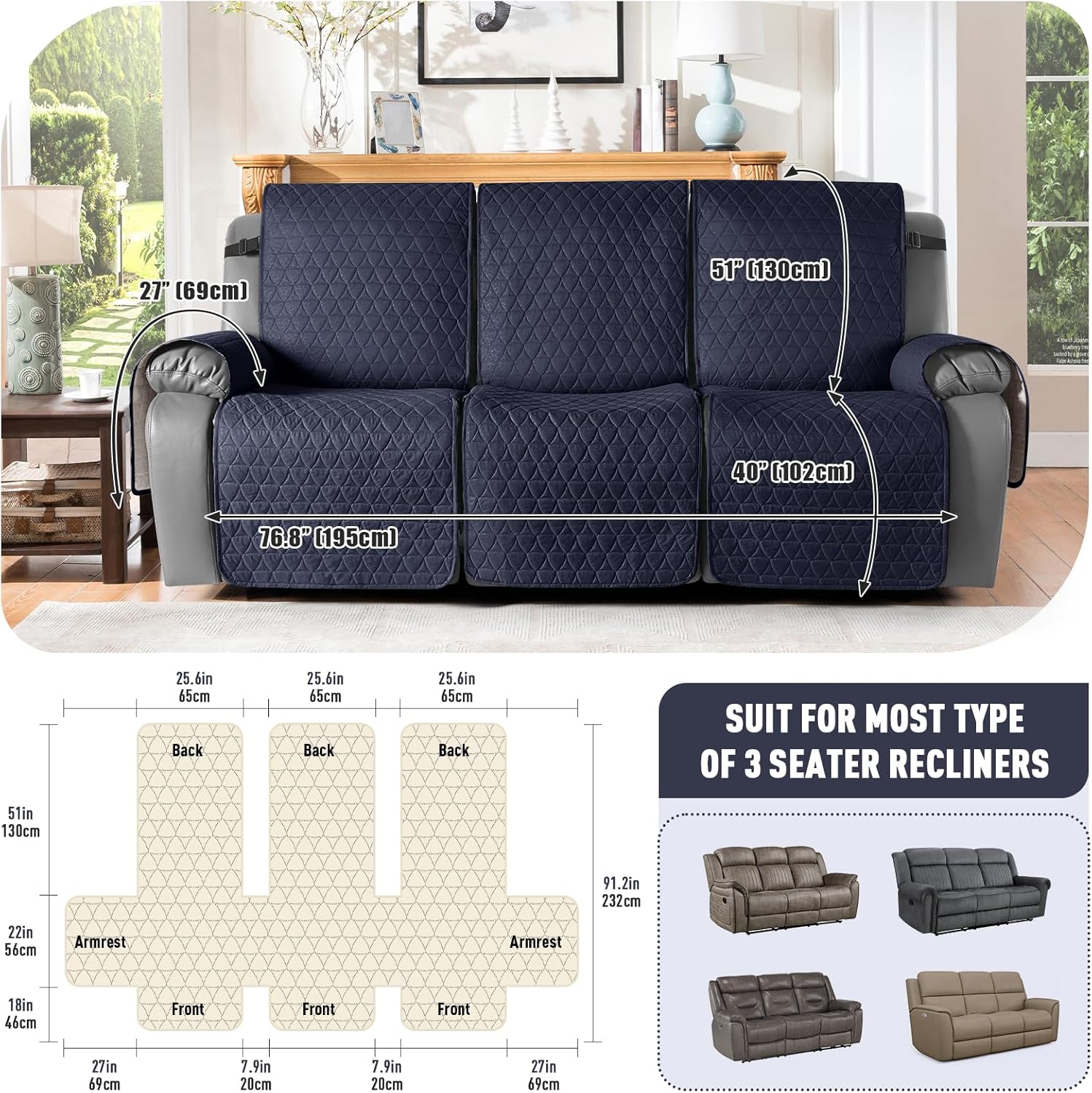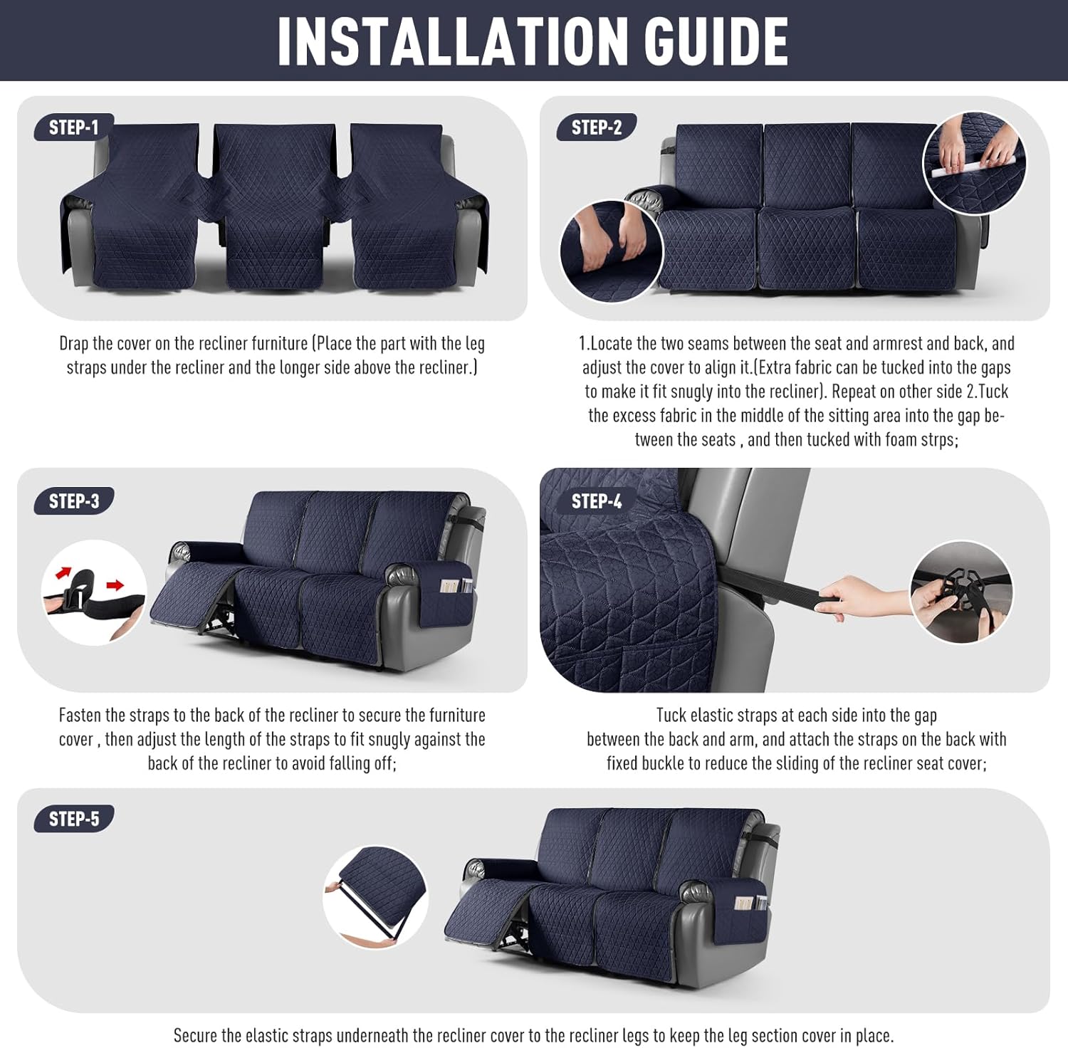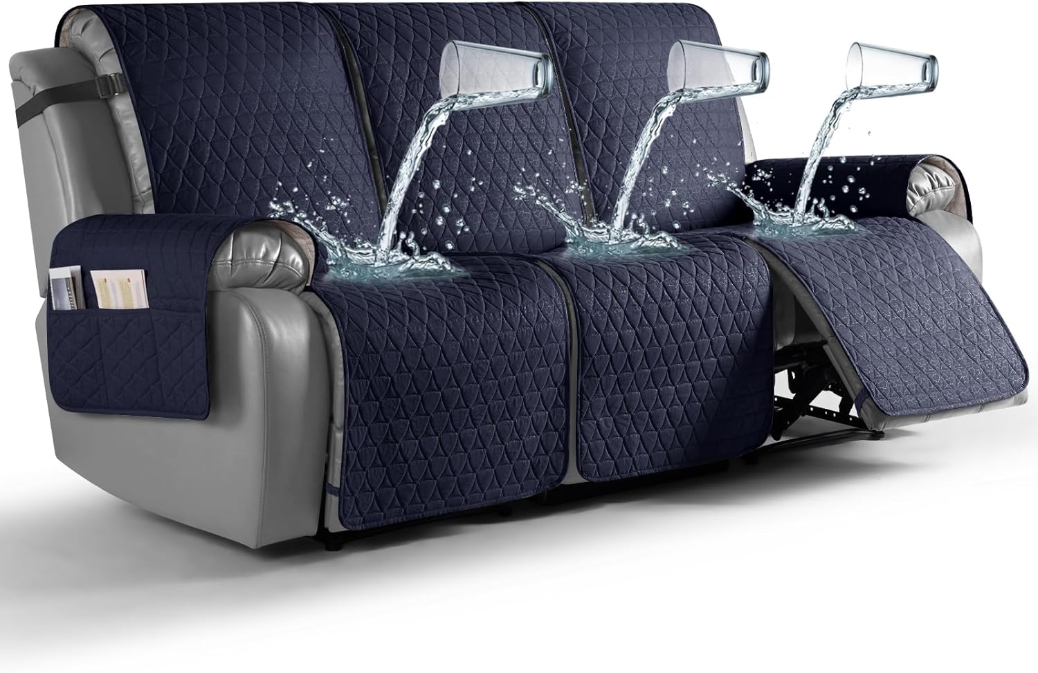 TAOCOCO 100% Waterproof Recliner Cover, Non-Slip Washable Reclining Couch Cover with Elastic Leg Straps, Furniture Protector for Dogs (Dark Blue, 3 Seater)