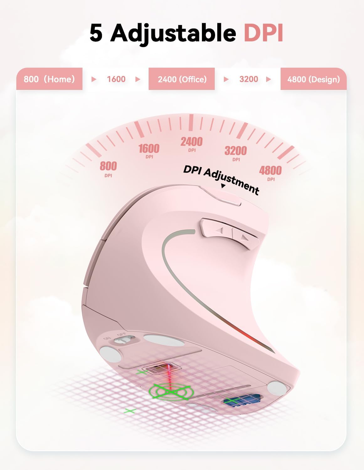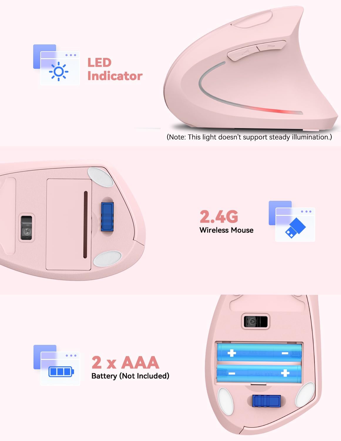TECKNET Ergonomic Wireless Vertical Mouse – 4800 DPI, 5 Adjustable Levels, 2.4GHz Optical, 6 Buttons for Carpal Tunnel – Laptop, Desktop, PC, MacBook Compatible – Pink