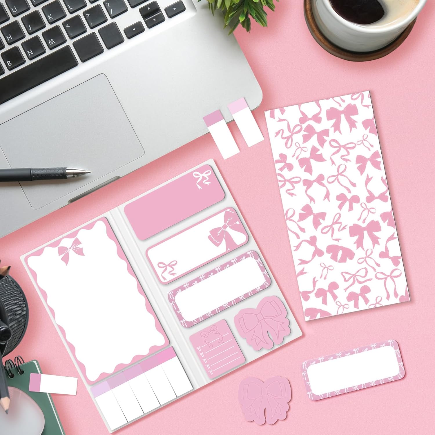 Package Includes: you will get 11 styles pink bow shapes sticky notes, and 43 sheets for each pad, total is 473 sheets; Enough quantity and cute styles are enough to meet your daily use and replacement needs; This set of note pads is really sweetness for adding to gifts or gift bags; These are a fun addition to party favors
