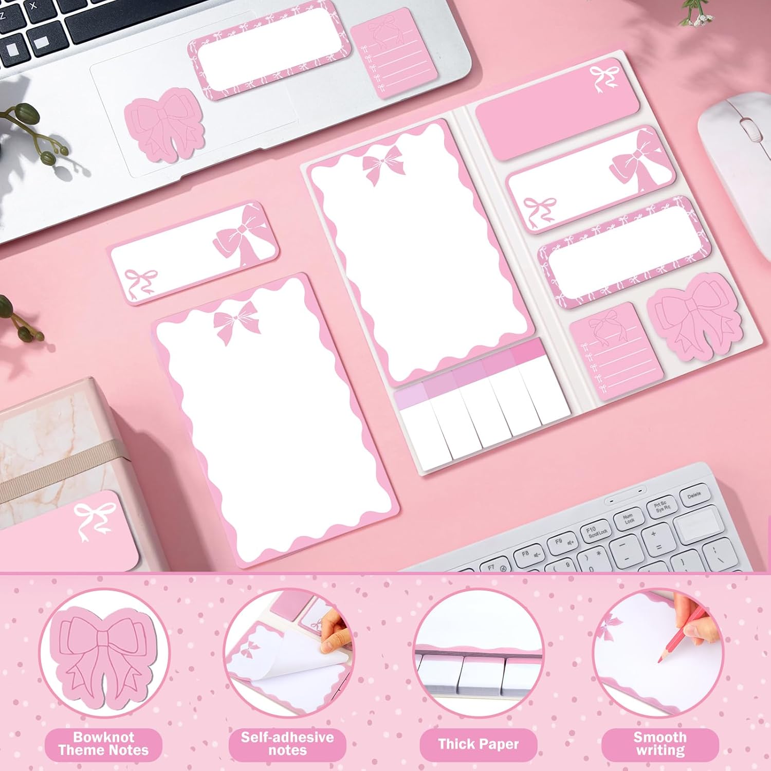 Quality Sticky Notes: these self-adhesive pink bow sticky memo notes are made of reliable quality paper, safe and odorless; Able to be applied for a long time with bright and vivid colors; Smooth surface for easy writing; Easy to tear off and good adhesion