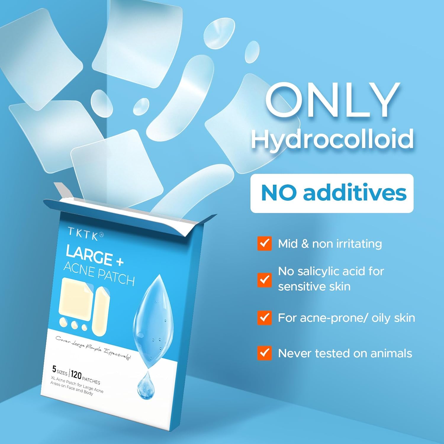 Perfect for Large Zit Breakouts: including 24 pcs of extra-large hydrocolloid patches, TKTK acne patches are designed for larger acne areas like your back, chest, or forehead. No need to deal with multiple small patches anymore