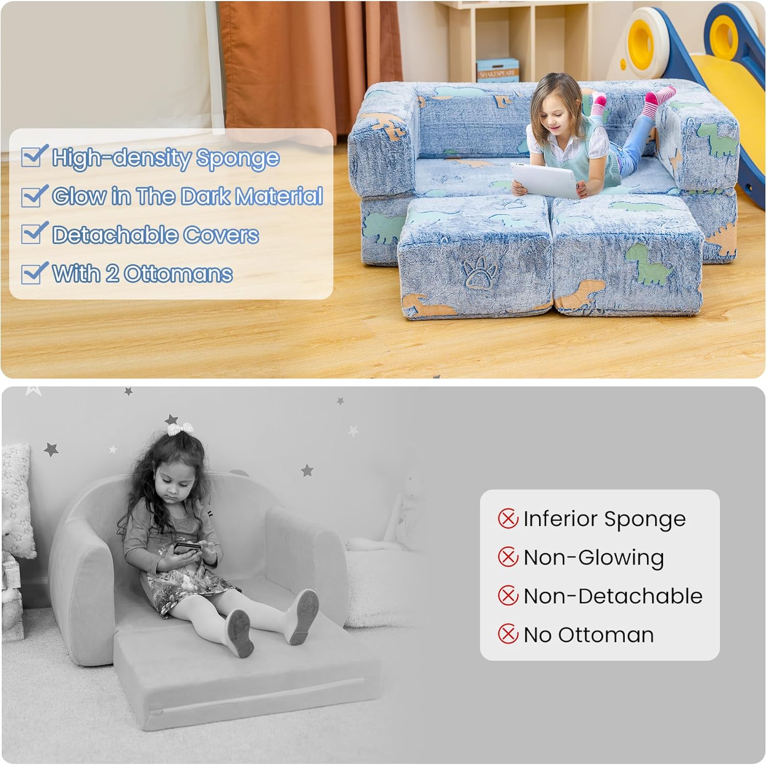 🔮【Kids Sofa with Excellent Unboxing Experience】-No assembly required.The toddler sofa will expand 100% within 30 seconds after unboxing!Don’t worry due to the long time compressed transportation, the toddler couch you received will be deformed and thinned.Because our kids Couch crafted with grade-A foam,It has high elasticity and no bad smell, which is an excellent choice for children.
