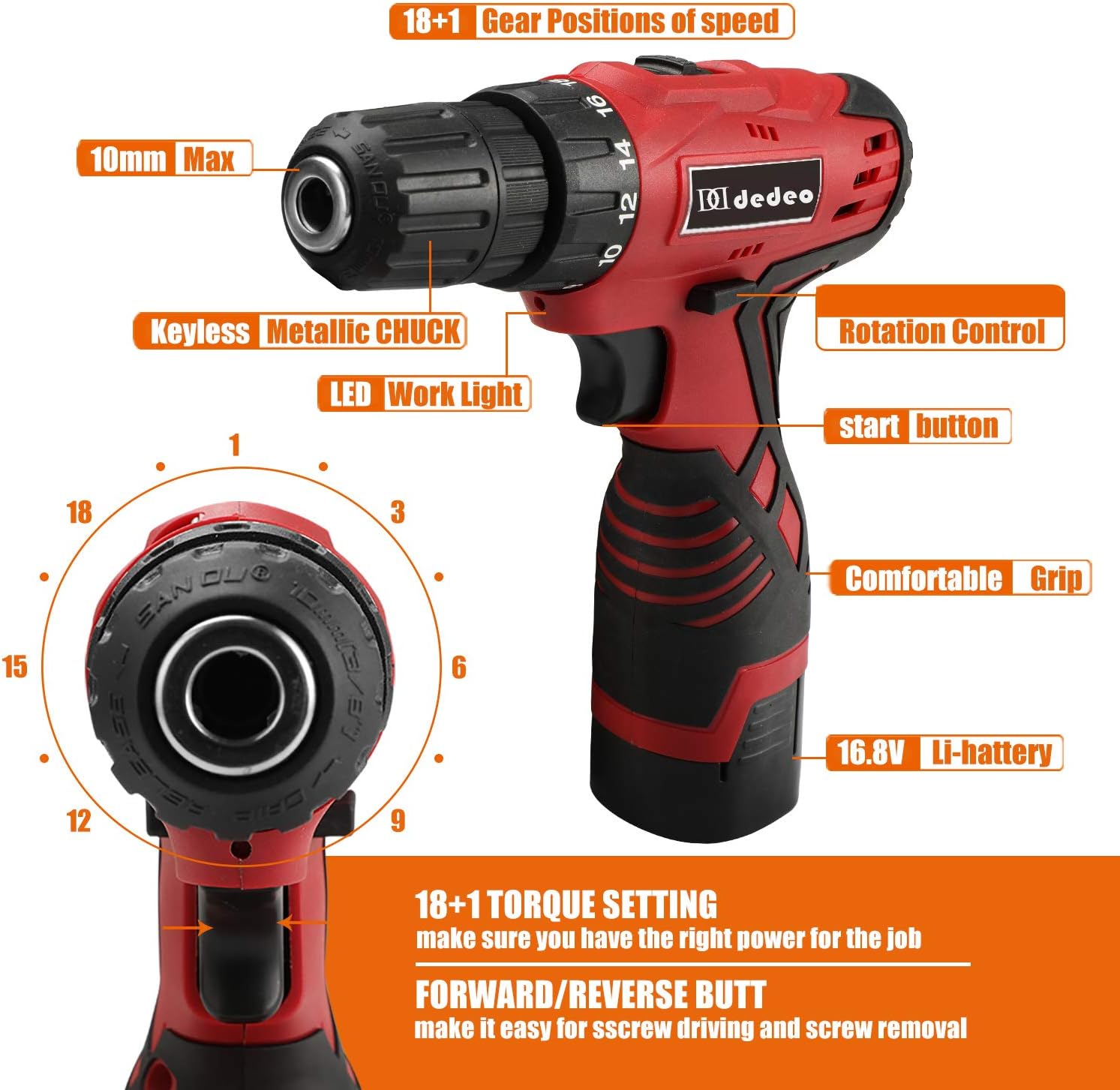 🧰【 High Performance】-This 16.8V cordless drill with 1500mAh large capacity Li-ion battery, you never need to worry about running out of power in the middle of a project. The battery is simple to change and charge.