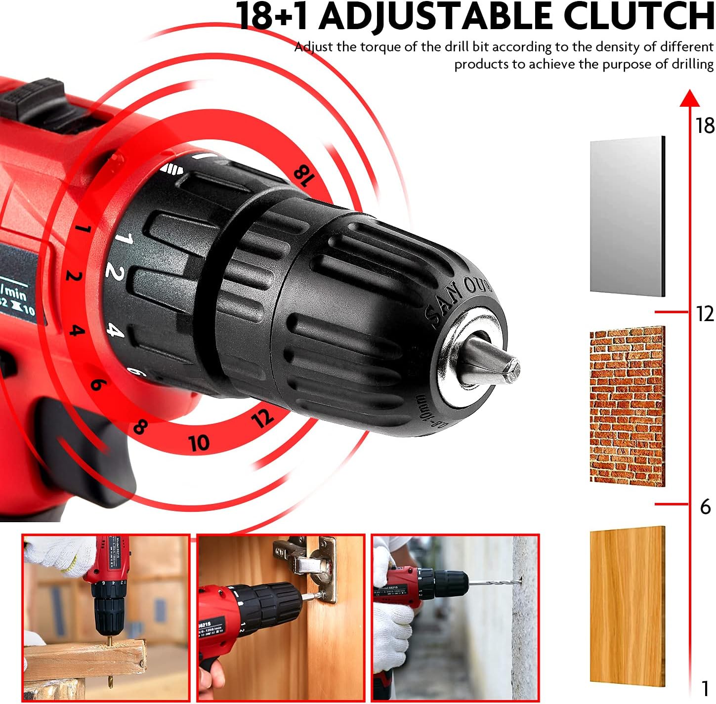 🧰【Cordless Drill Set】- Large 3/8″(10mm) keyless chuck can provide you superior bit retention,Equipped with 3-in-1 working mode, screw driving, drilling and impact drilling, this variable-speed (0-350RPM, 0-1350RPM) and 18+1 position drill is a powerful all-round helper for matching your desires, perfect for professional and DIYers