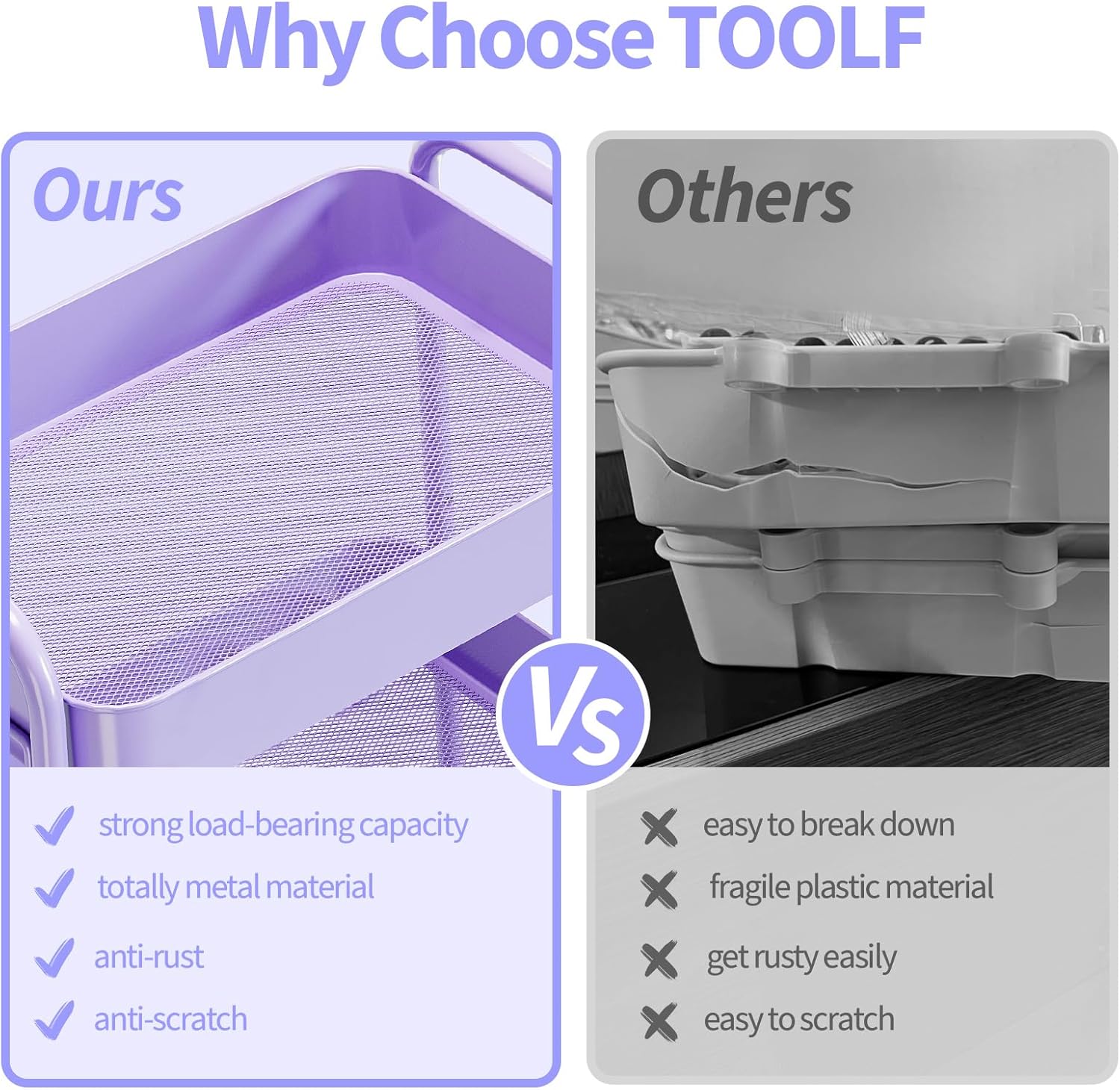 TOOLF 3-Tier Metal Rolling Cart with Wheels, Storage Utility Organizer Cart for Kitchen, Bathroom, Office, Baby Essentials & Makeup – Lockable Casters, Easy Assembly, Large Capacity, Purple