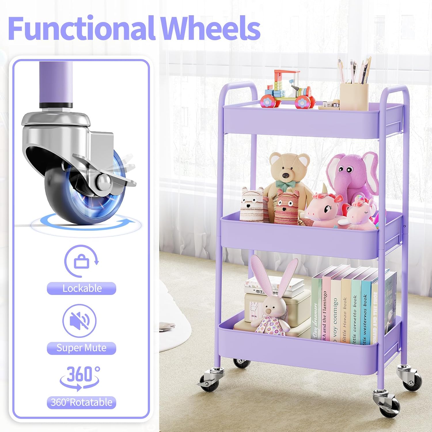 The utility cart helps store toys and children’s books while fostering good organizational habits.