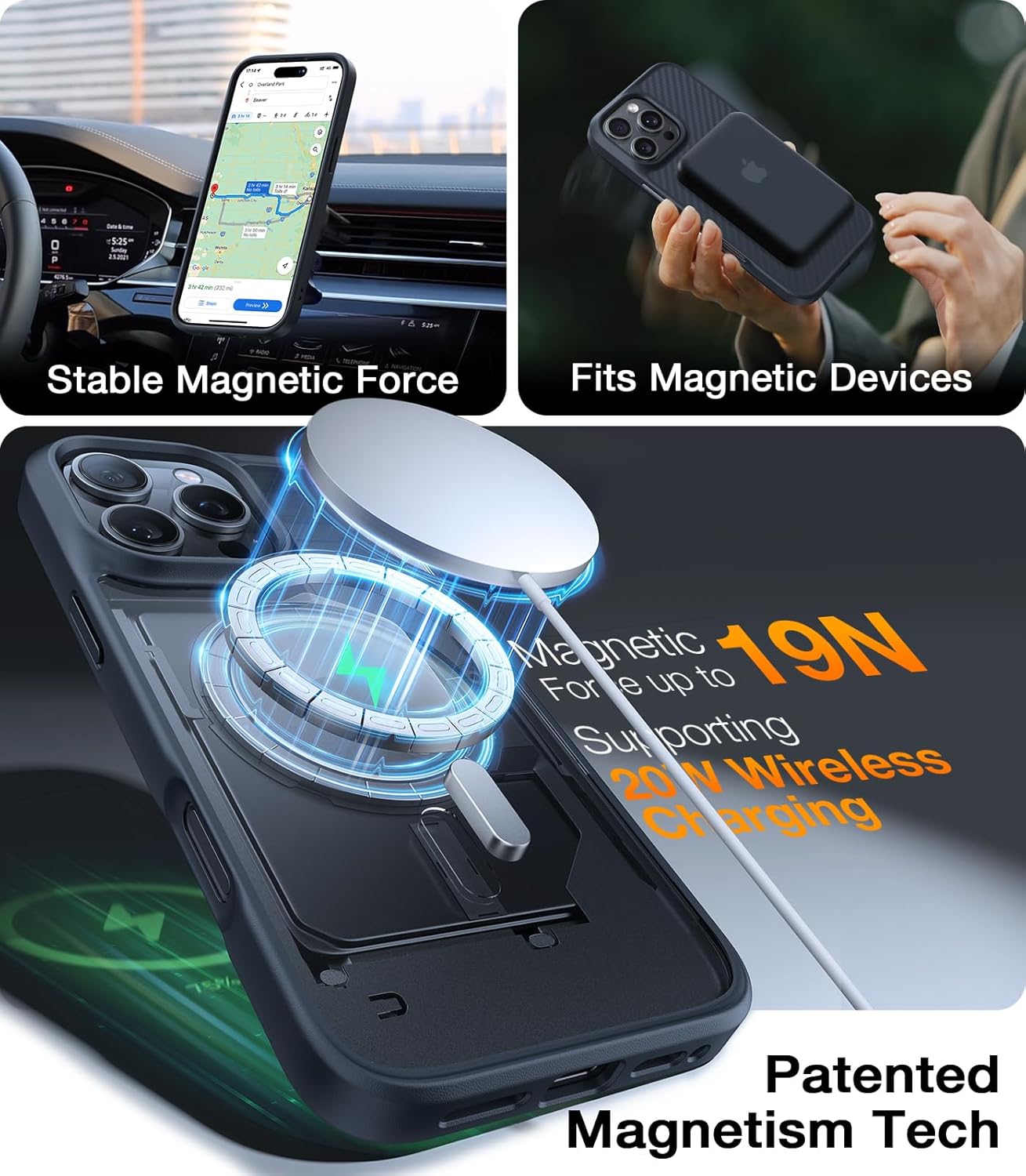 [Powerful Magnet Locks Firmly & Charge Quickly] Featuring over 38 N56 neodymium permanent magnets and MegaMag patented tech, this magnet is not only 2X stronger than others but also seamlessly works with all your Mag accessories. It holds up well on your Mag car mount, even over strong bumps