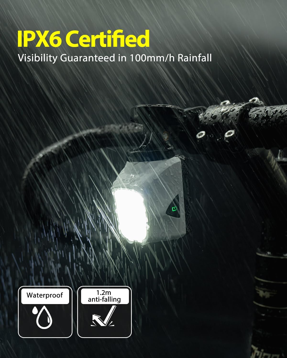 Built Tough for Any Adventure:These LED bike lights are IPX6 waterproof, handling heavy rain with ease.With 1.2-meter drop resistance, they’re built to survive rough trails and extreme conditions.
