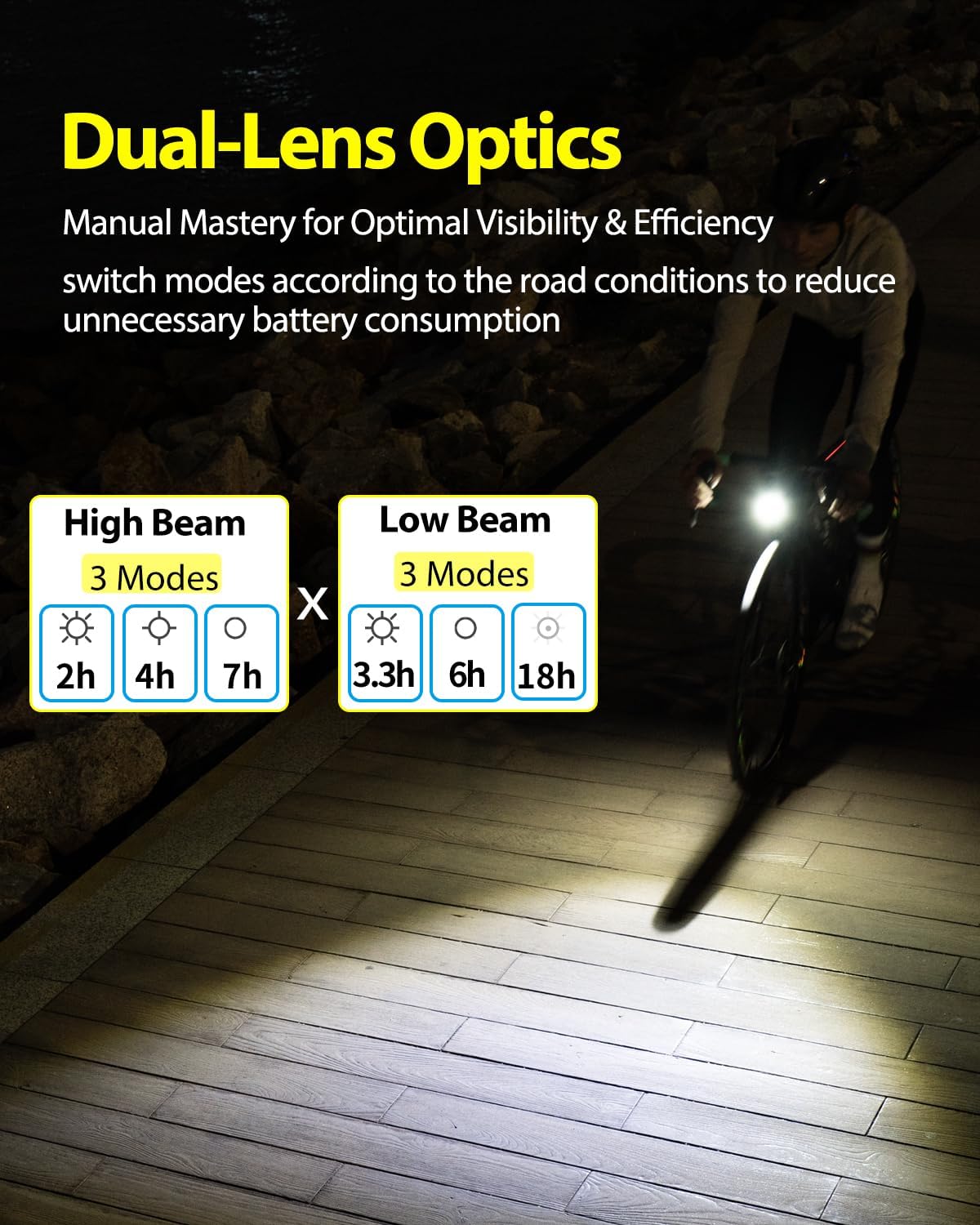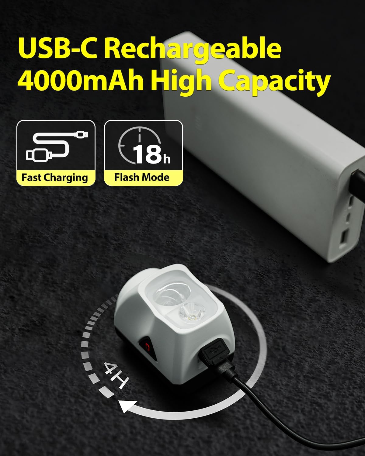 Long Battery Life, Less Worry:Enjoy 7 hours of light or 18 hours in flashing mode—ideal for all-night safety. The smart thermal control prevents overheating, while the 4000mAh rechargeable battery can even charge your phone in emergencies.