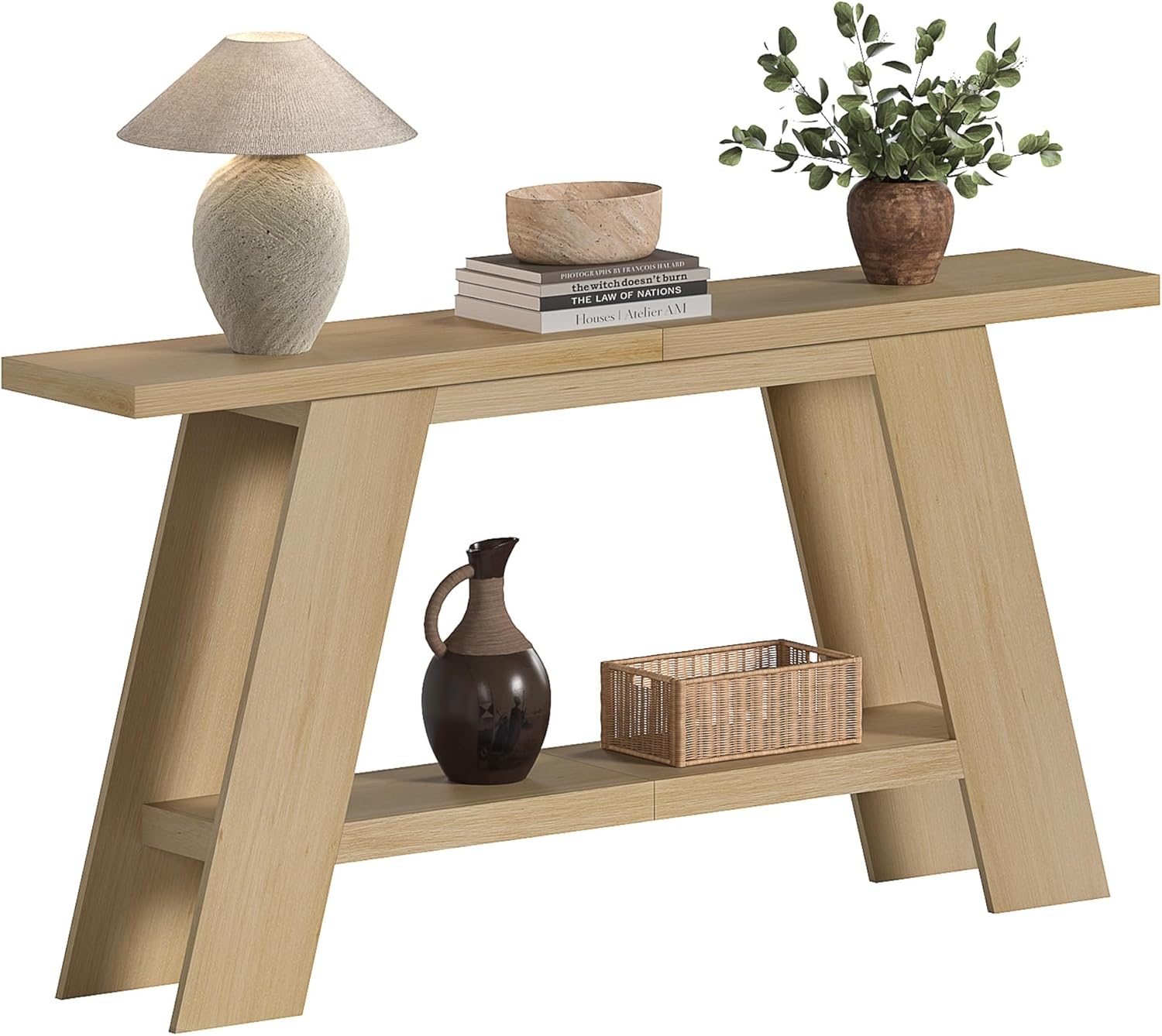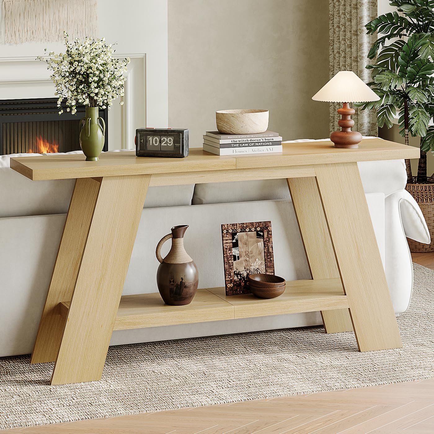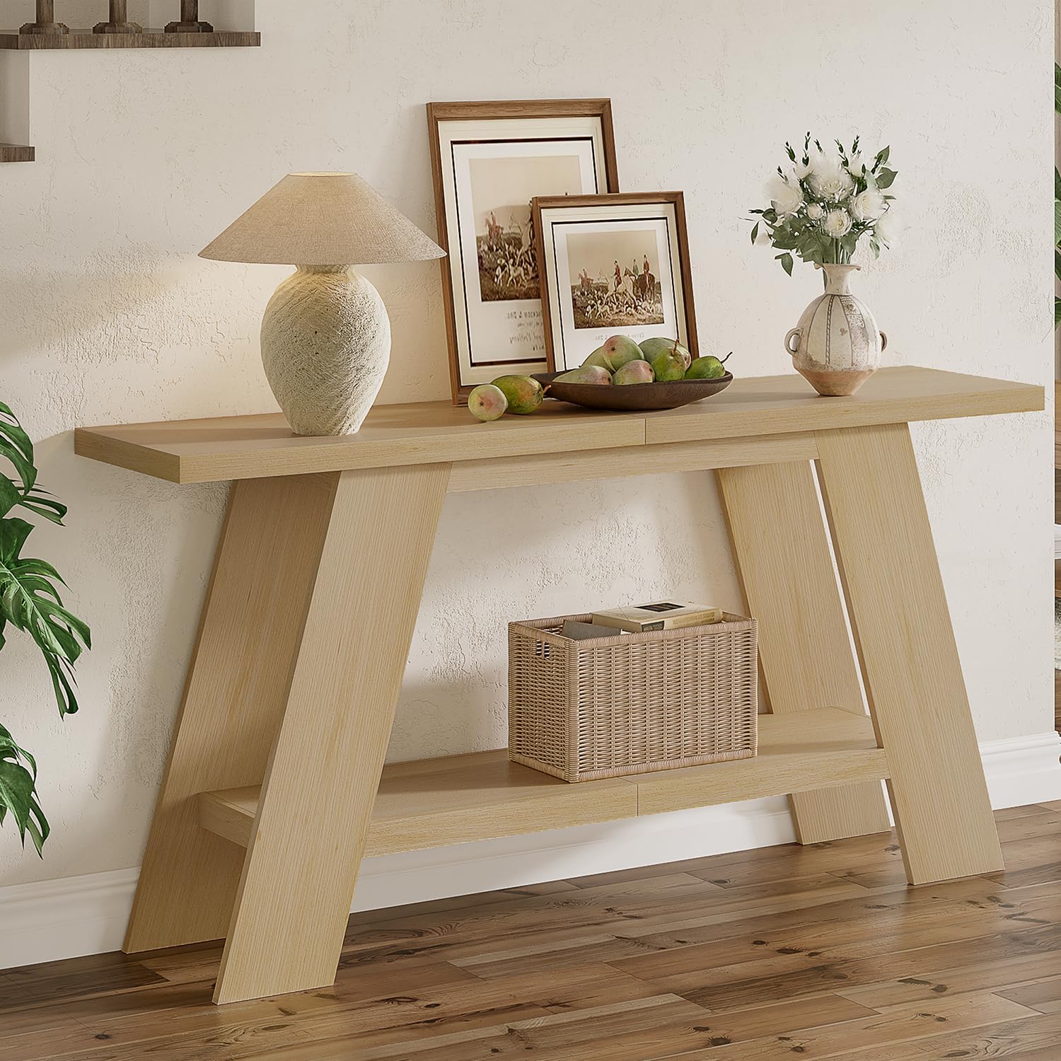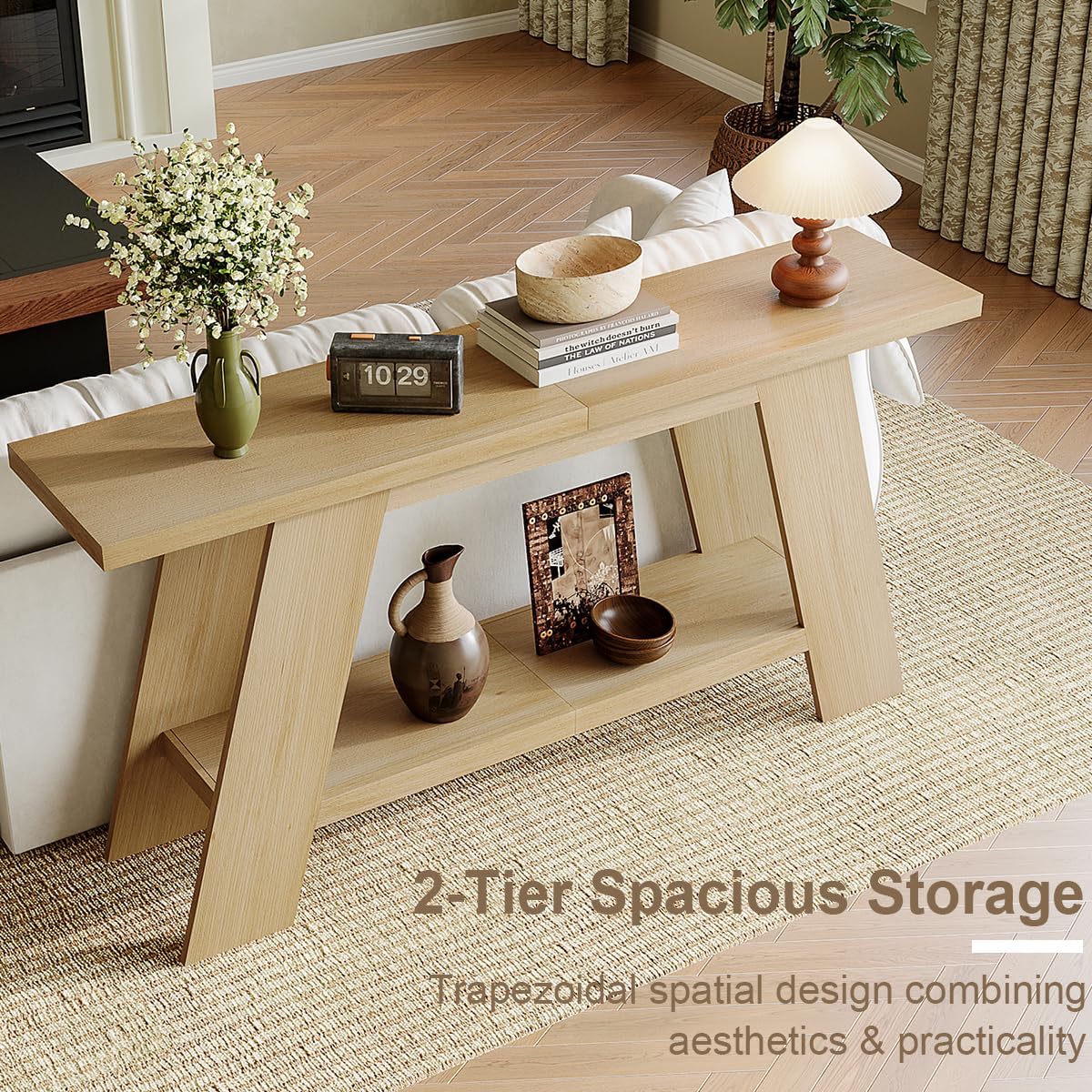 【Solid & Sturdy Construction】: The long console table features a 1.57 inch thickness tabletop and 3.54 inch wide legs, which can easily hold heavier decorations. The unique trapezoidal structure is not only eye-catching but also ensures long-lasting stability for daily use