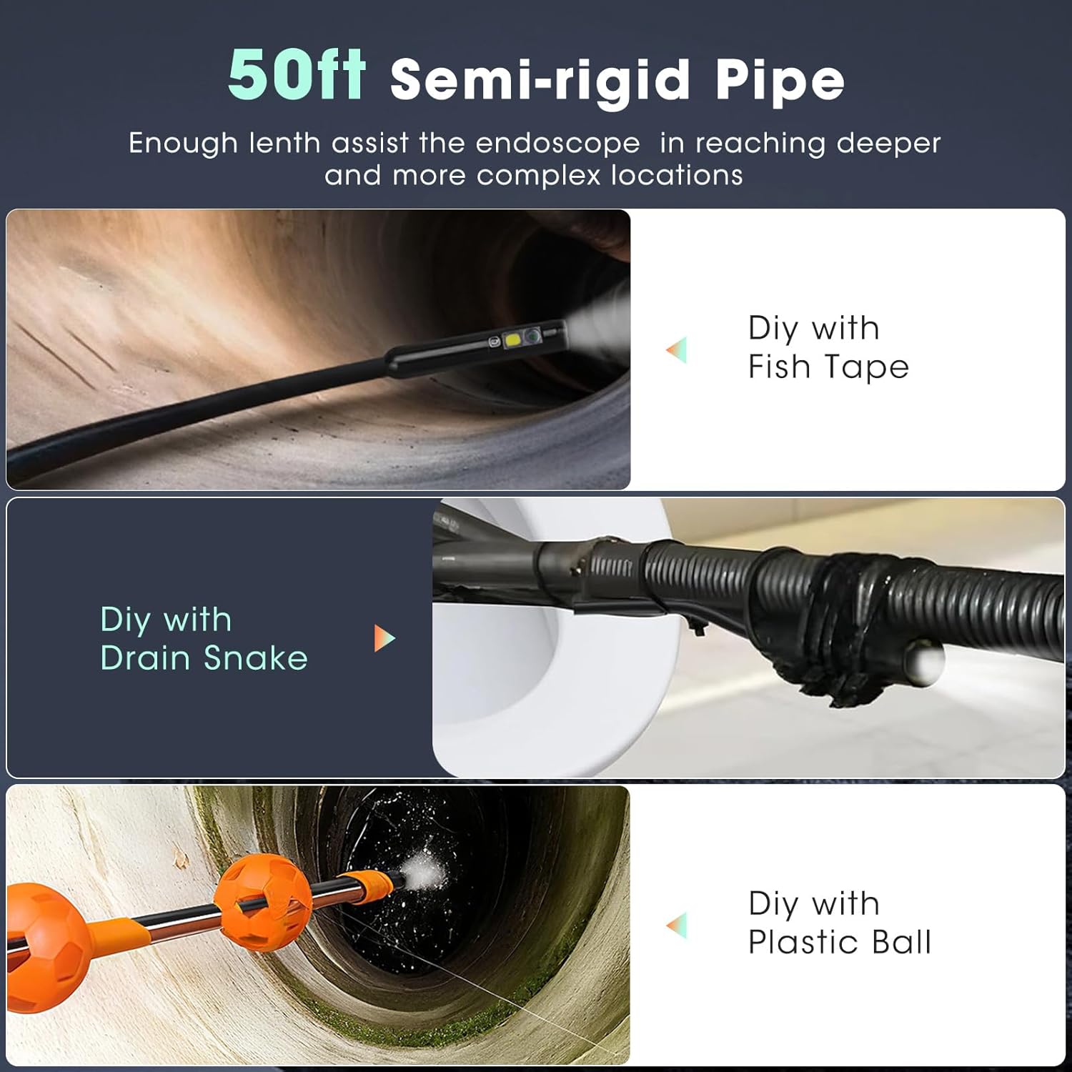 50FT Semi-Rigid Waterproof Cable: This industrial endoscope camera features a 50ft semi-rigid cable that bends to reach narrow or curved areas while staying firm for accurate positioning. With IP67 waterproof rating, it easily handles sewer inspections, plumbing maintenance, fish tanks, or outdoor drains, making it reliable for wet or complex environments.